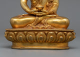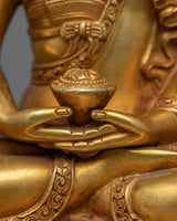 This statue, which depicts Buddha Amitabha in great detail, becomes a symbol of spirituality and artistic prowess. The sculpture, which stands 7.8 inches tall, is a true tribute to the sutra's teachings. Every detail of the deity is lovingly brought to life on a 5.5-inch-wide base. The rusted copper base tells stories of unrivaled craftsmanship, decorated with the radiance of 24k gold gilding and hand-painted acrylic decorations. Amitabha's peaceful face exudes compassion, promising guidance to his Western Paradise.