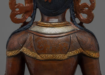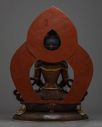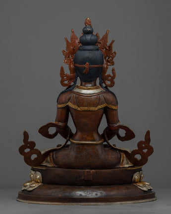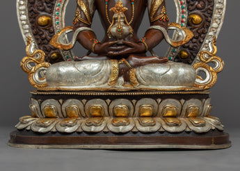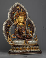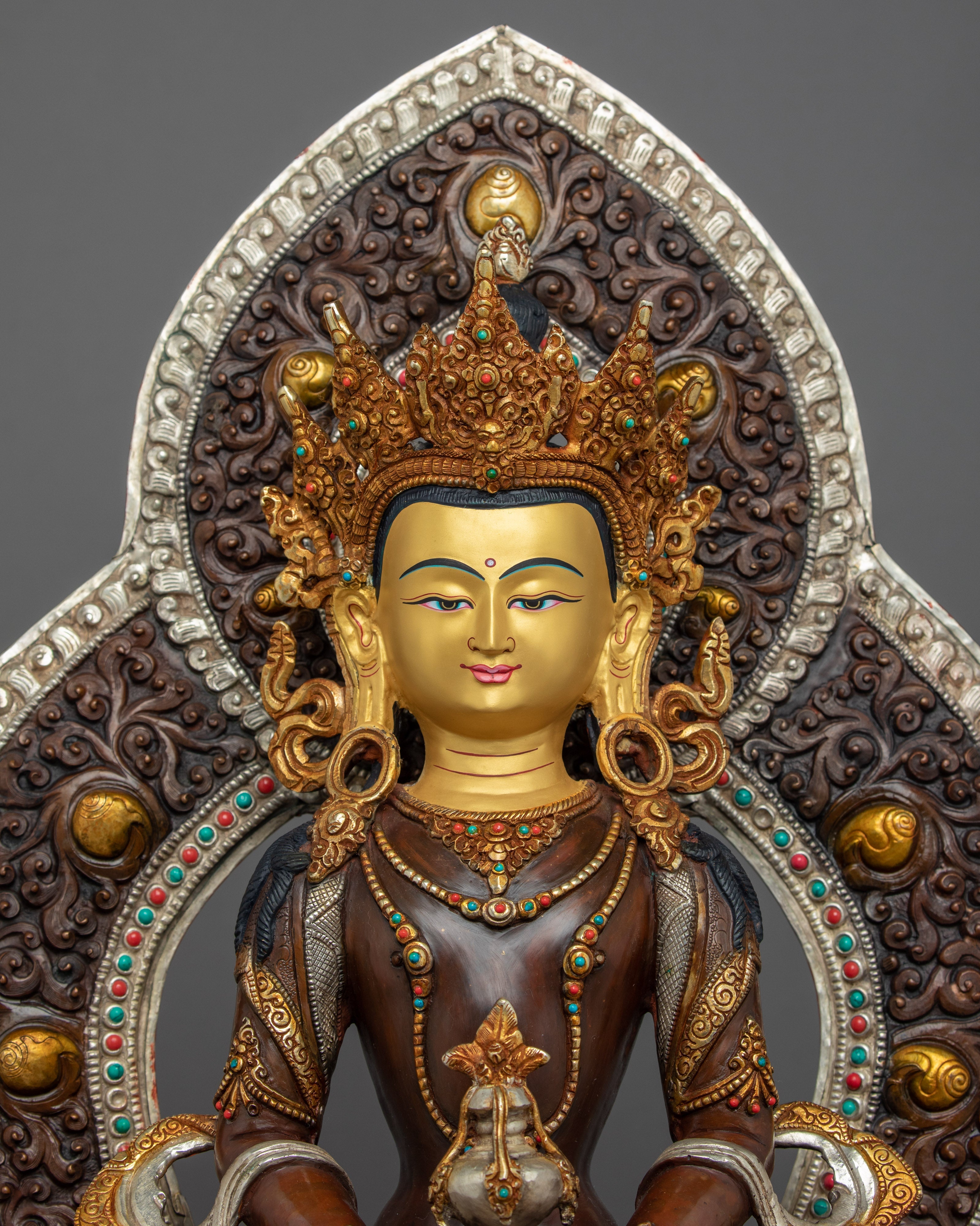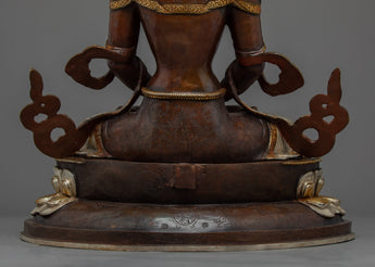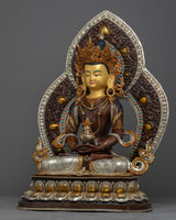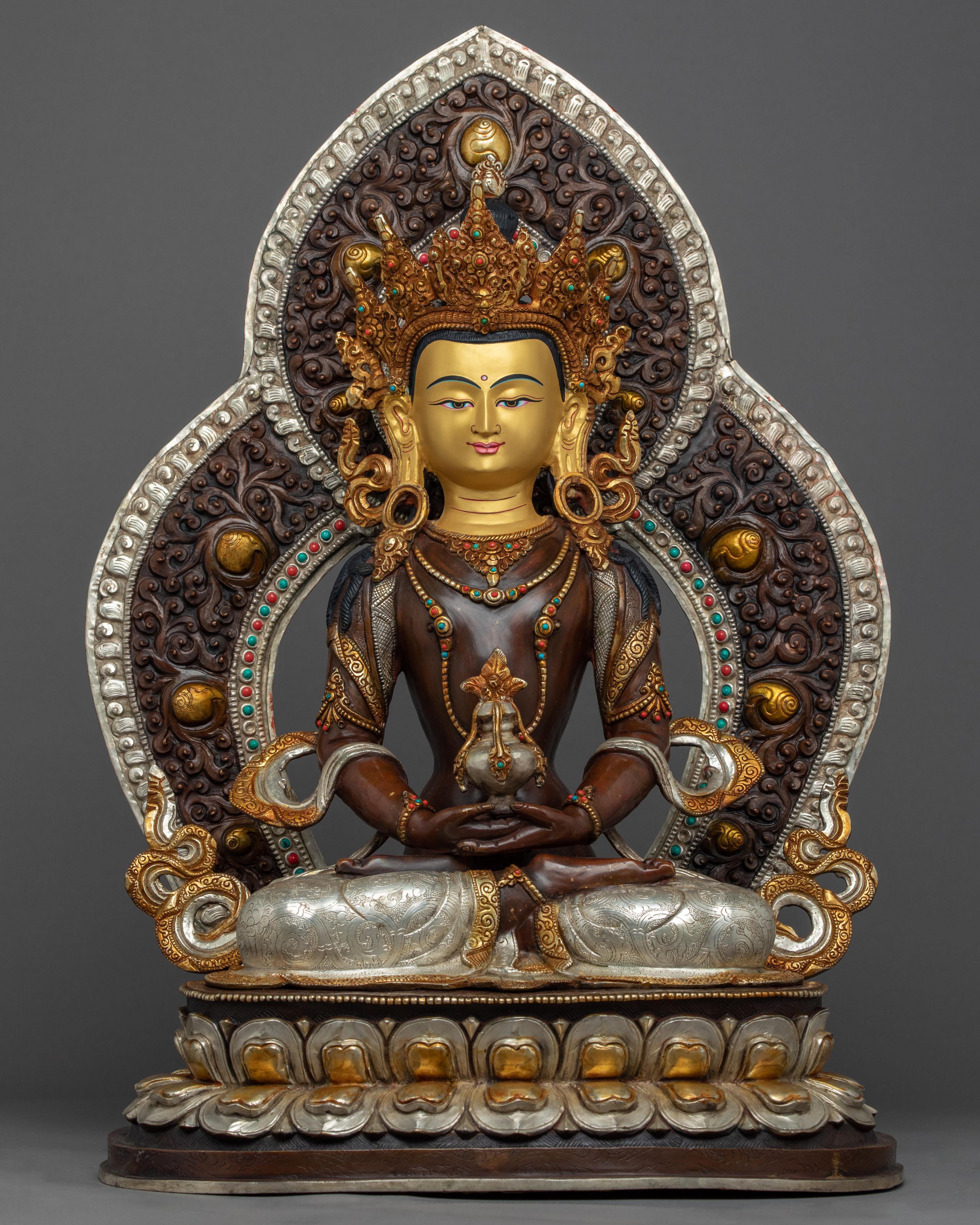 Traditionally crafted, the Buddha Amitayus Gold Sculpture is handcrafted by the master craftsmen of Nepal. The body of this sculpture is made of copper and the authentic 24-karat gold gilded highlights the deity's intricacies. The deity is seated on a moon disc lotus with a peaceful expression as he holds a vase above his lap with both hands. This particular statue of the Amitayus Buddha took our artists months of hard work to craft as he is carved with intricate design patterns exclusively done in Nepal. Decorated with numerous body ornaments which have been embedded with many gemstones and plated with silver.