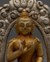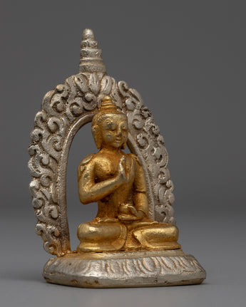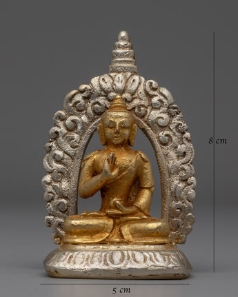 The handcrafted Buddha Amoghasiddhi Statue is a stunning example of spiritual art; its copper and brass radiates grace and strength. This statue, which stands 8 cm tall, is tastefully decorated with gold and silver plating, which highlights the subtle features of Buddha Amoghasiddhi's tranquil and powerful form and amplifies its holy presence. The statue is a stunning focal point for any meditation or spiritual area because of the gold plating, which provides a hint of elegance and brilliance.