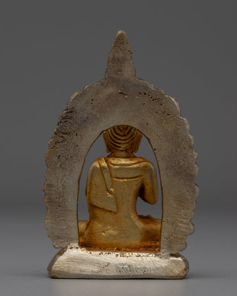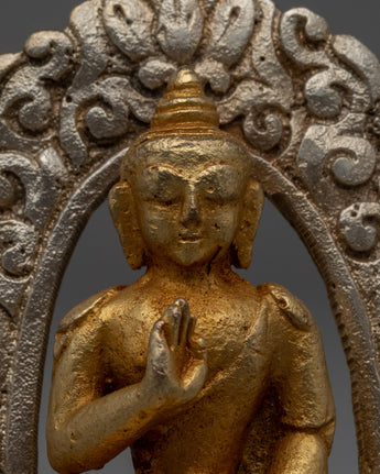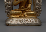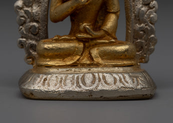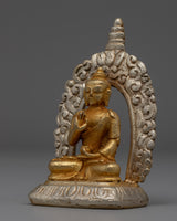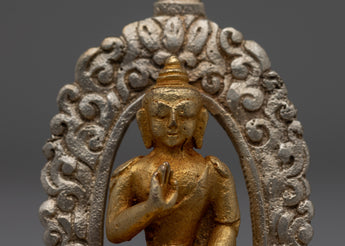 The silver-plated halo that encircles Buddha Amoghasiddhi contrasts beautifully with the golden body, emphasizing the statue's ethereal appearance. The delicate craftsmanship is emphasized by the mix of gold and silver, which also represents the unification of the material and spiritual domains. This statue, which represents the knowledge and enlightenment of Buddha Amoghasiddhi, is a significant and lovely addition to any altar or collection due to its well-thought-out design and superb execution.