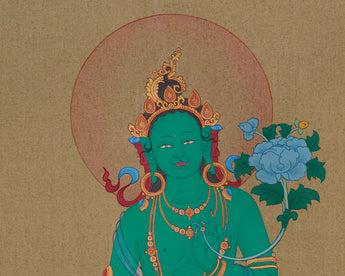 A Buddha Art of Green Tara, also known as Sgrol-ljang, is a hand-painted thangka on premium cotton canvas, created in the traditional Karma Gadri style. The vibrant acrylic colors and 24K gold accents add depth and life to the thangka, while the authentic 24K gold accents highlight its sacred nature. Our skilled artists carefully apply these materials with precision and devotion, honoring centuries-old Tibetan Buddhist techniques to create a spiritual masterpiece that is both visually captivating and culturally authentic. The thangka symbolizes compassion, protection, and swift assistance to needy people.