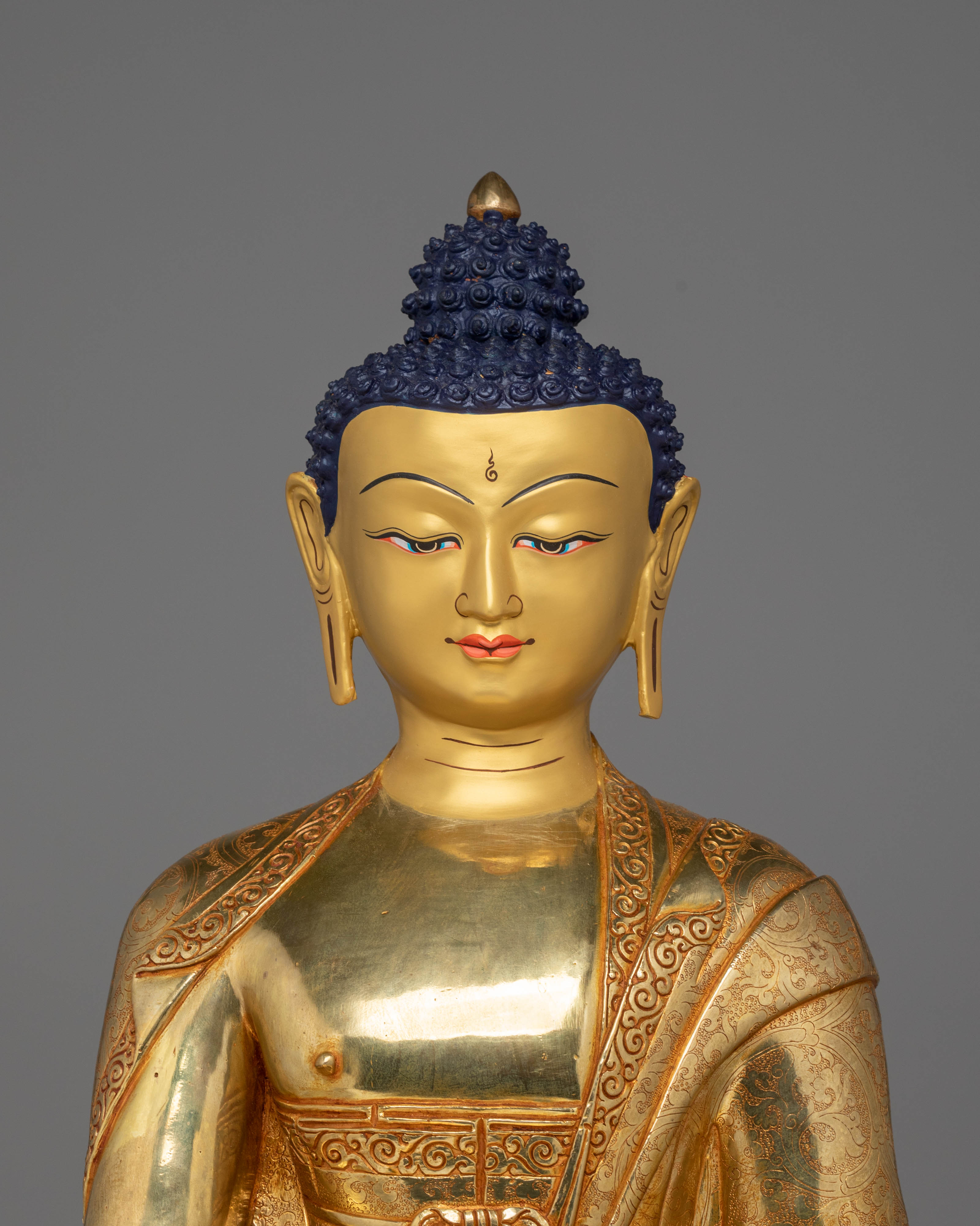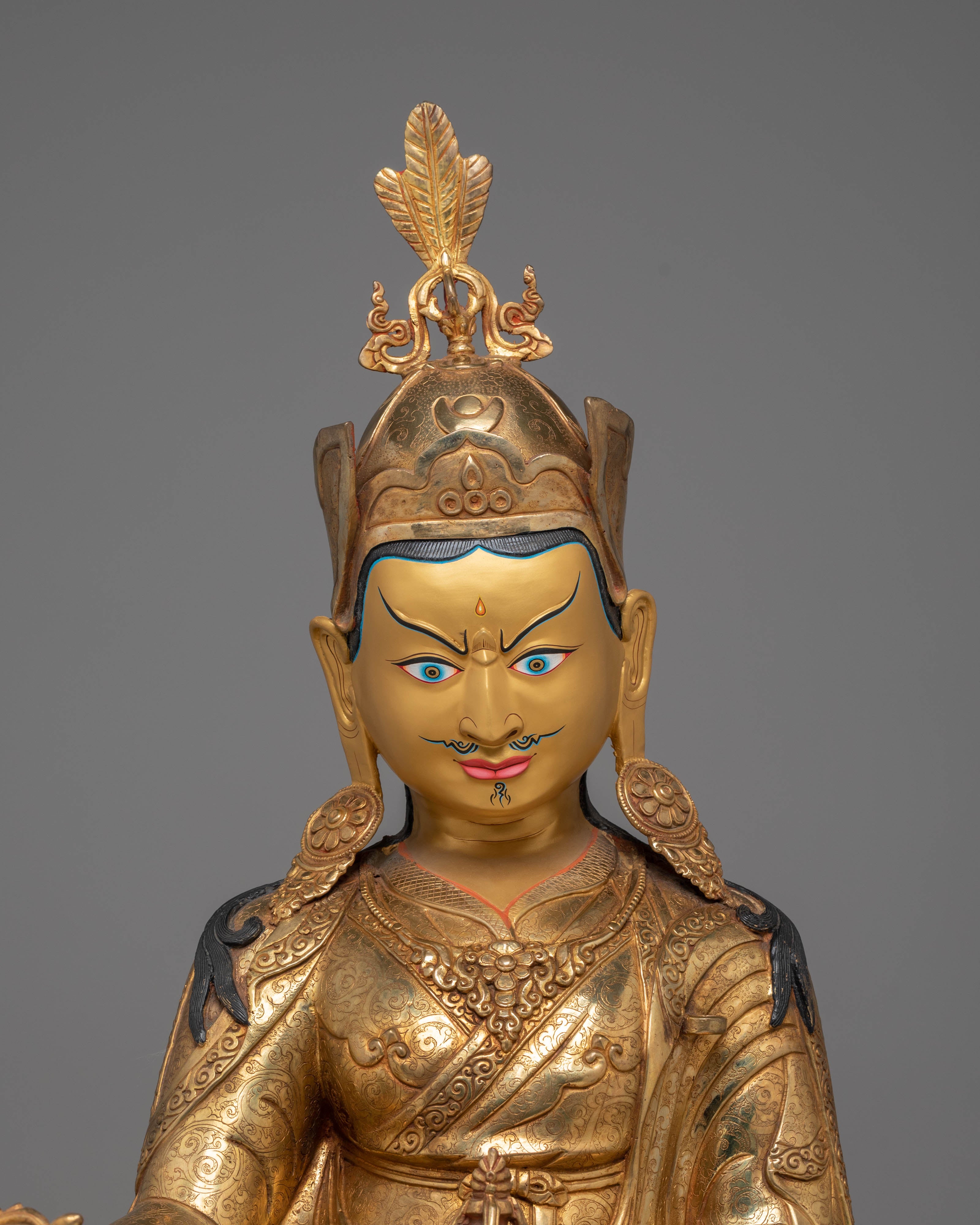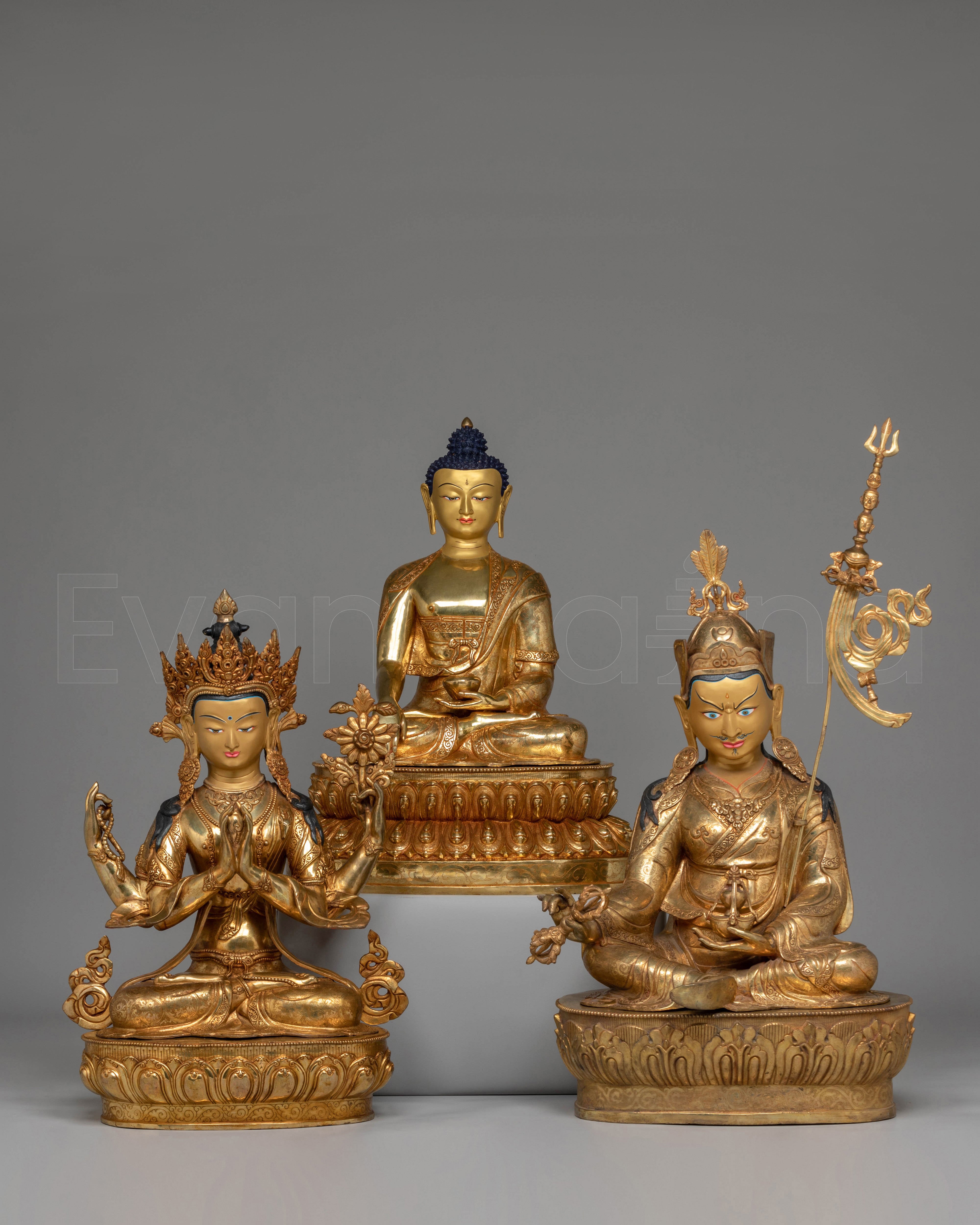 Each figure in the collection is adorned with complex symbolism and deep meanings. Shakyamuni Buddha, the historical Buddha, is the personification of wisdom and enlightenment, representing the ultimate route to Nirvana. Guru Rinpoche, also known as Padmasambhava, is renowned for introducing Buddhism to Tibet, and his image represents the power of change and spiritual protection. Chenrezig, the Bodhisattva of Compassion, represents unlimited love and mercy and is famed for his strong bond with all sentient beings. The 24K gold-plated copper body, paired with the acrylic color, highlights the delicate intricacies of each deity's tranquil look and spiritual presence.
