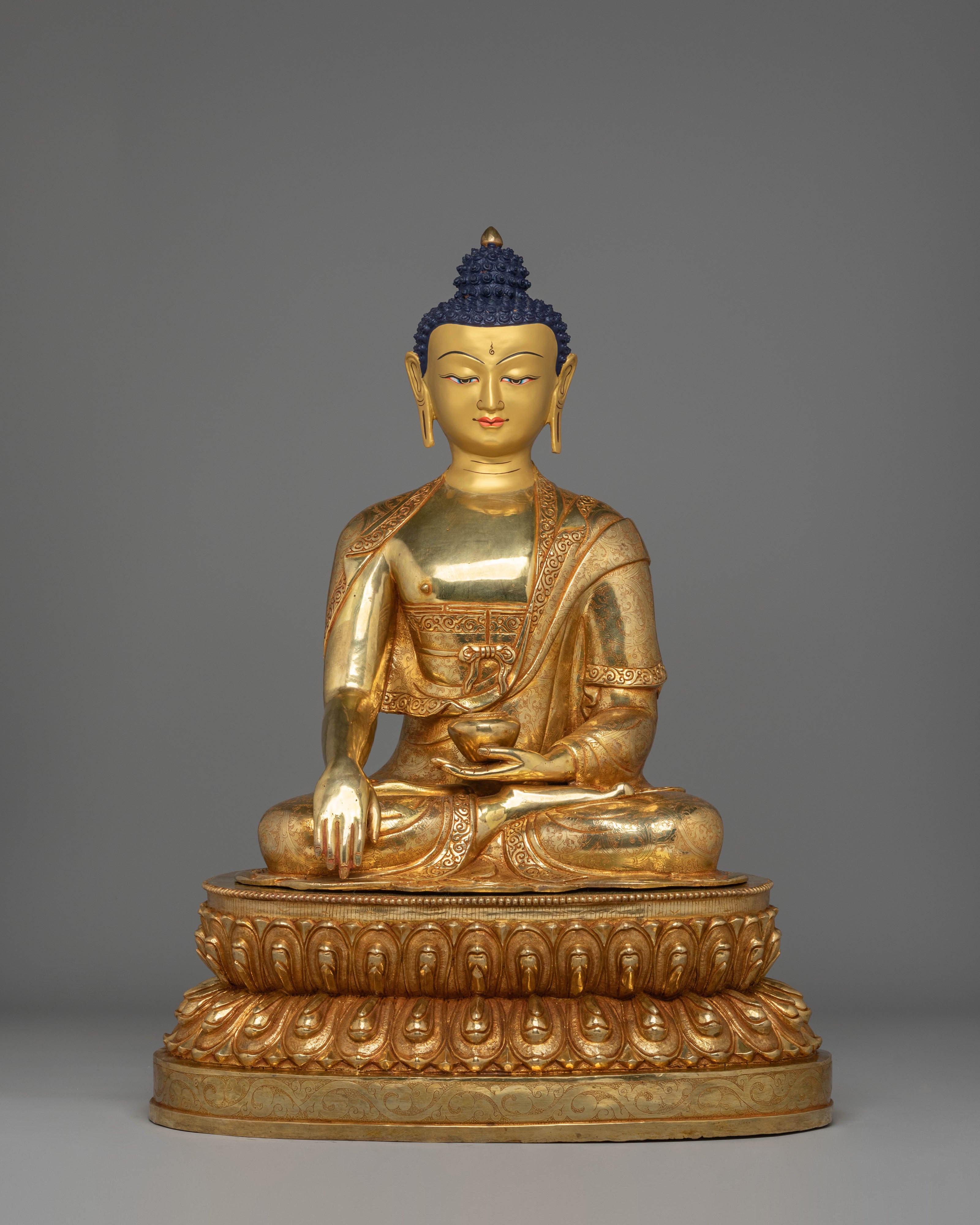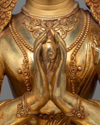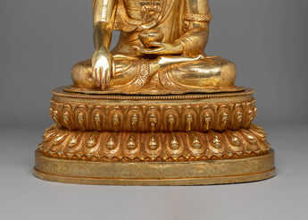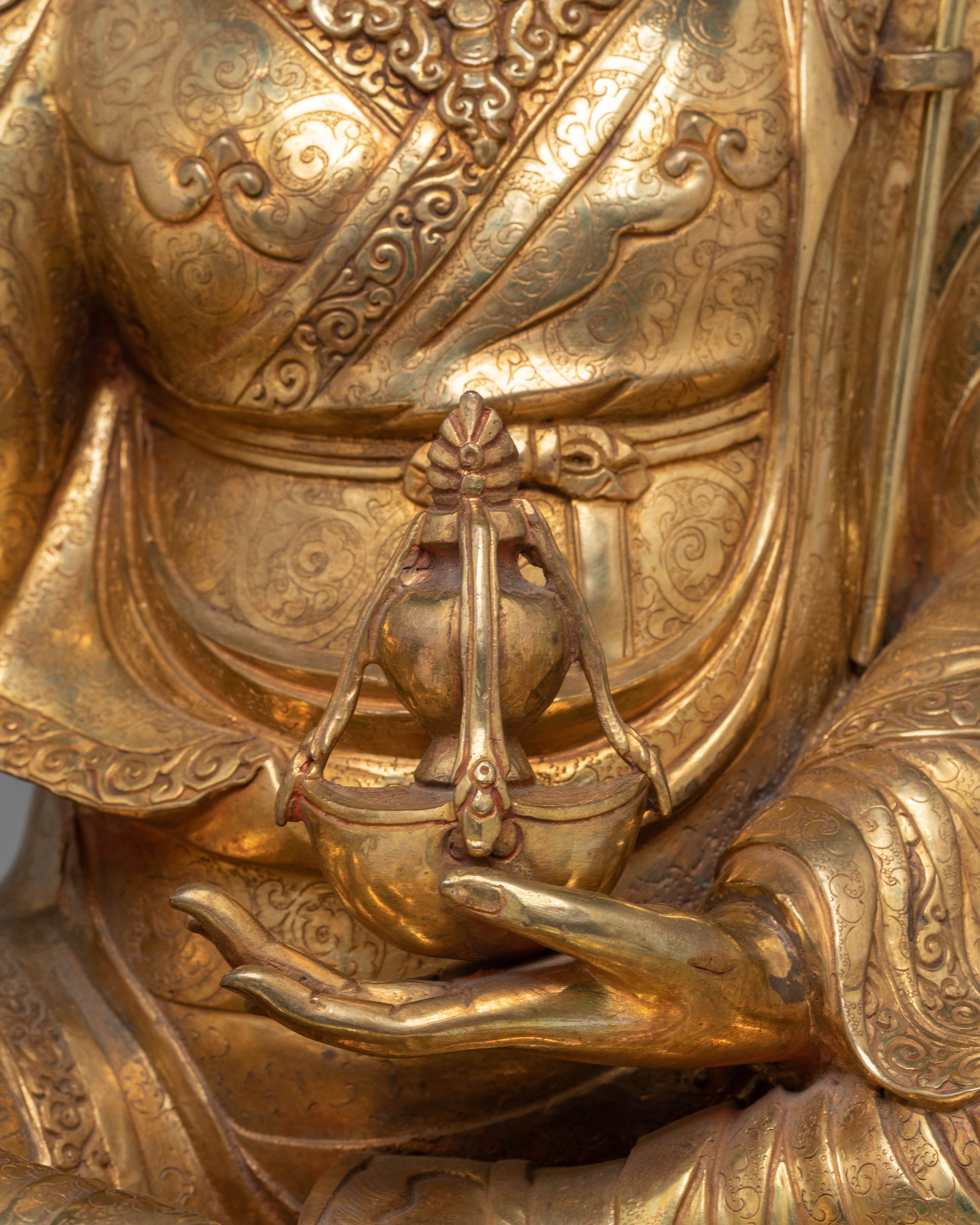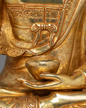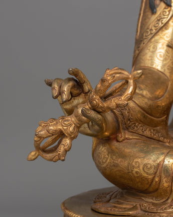 Each figure in the collection is adorned with complex symbolism and deep meanings. Shakyamuni Buddha, the historical Buddha, is the personification of wisdom and enlightenment, representing the ultimate route to Nirvana. Guru Rinpoche, also known as Padmasambhava, is renowned for introducing Buddhism to Tibet, and his image represents the power of change and spiritual protection. Chenrezig, the Bodhisattva of Compassion, represents unlimited love and mercy and is famed for his strong bond with all sentient beings. The 24K gold-plated copper body, paired with the acrylic color, highlights the delicate intricacies of each deity's tranquil look and spiritual presence.