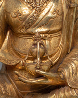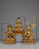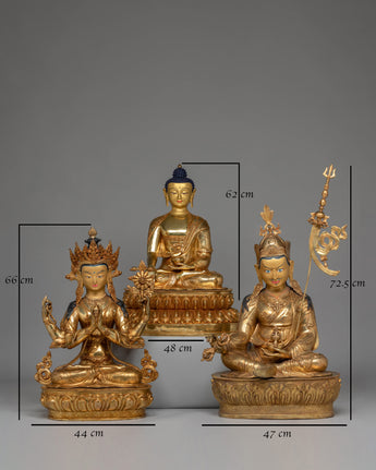 This exquisite Buddha Dharma Sangha Set includes three revered spiritual images, each expertly carved in 24K gold-plated copper and perfectly representing Tibetan Buddhist iconography. The set contains Shakyamuni Buddha, Guru Rinpoche, and Chenrezig. Standing at remarkable heights—Shakyamuni Buddha at 62cm, Guru Rinpoche at 72.5cm, and Chenrezig at 66cm—each artwork is a unique blend of sacred heritage and artistic grace, weighing 53.92kg. These statues exude spiritual importance and are suitable for meditation areas, altars, or collections honoring Tibetan Buddhism.