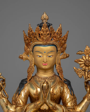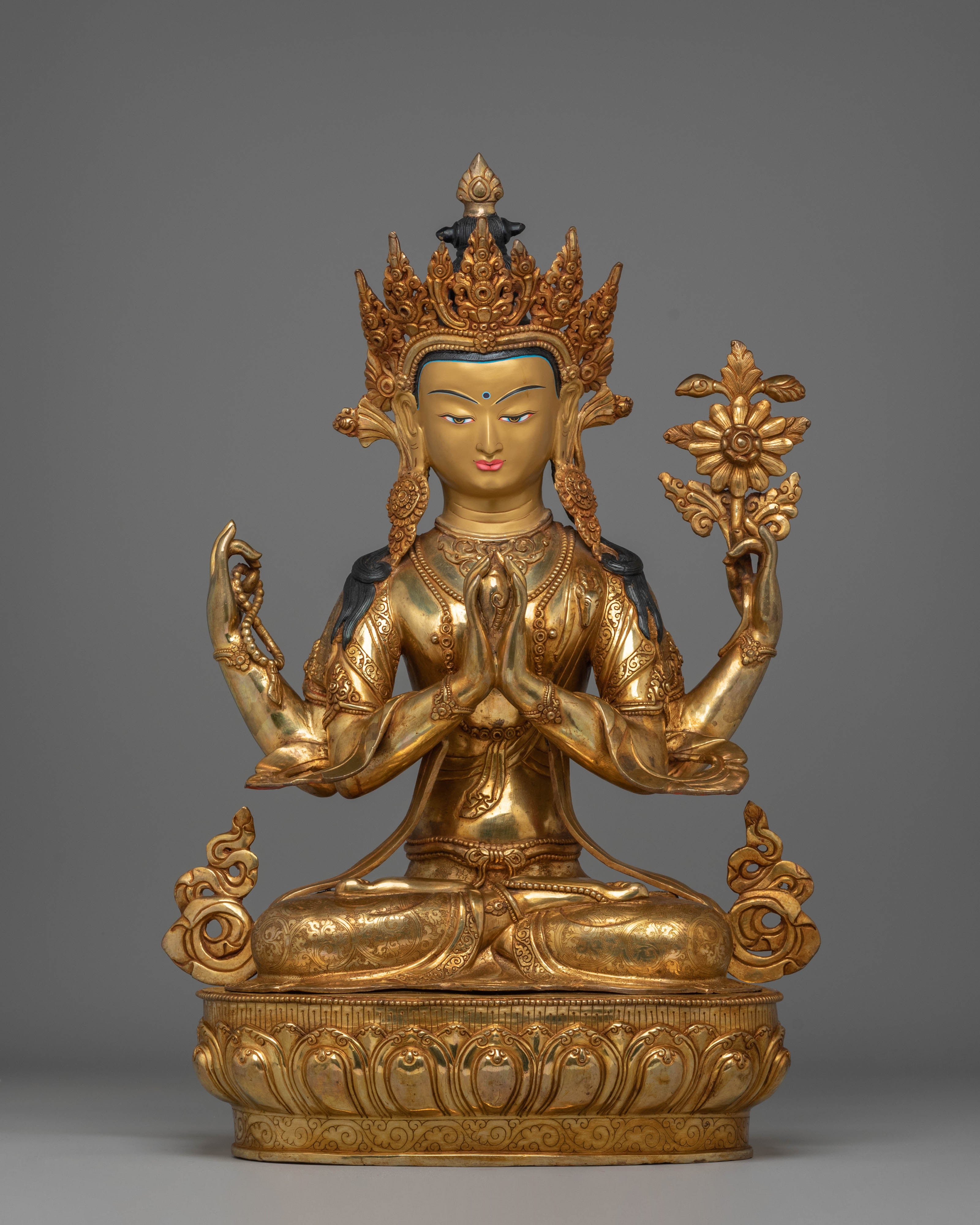 Chenrezig (Avalokiteshvara) is revered across Buddhist traditions as the Bodhisattva of Compassion, embodying the selfless love and mercy of all Buddhas. He is believed to hear the cries of all sentient beings and endeavors to alleviate their suffering. His mantra, "Om Mani Padme Hum," is widely chanted to invoke his benevolent blessings and cultivate compassion within oneself.