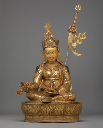 Guru Rinpoche, also known as Padmasambhava, is one of the most venerated figures in Tibetan Buddhism. Believed to have introduced Buddhism to Tibet in the 8th century, he is regarded as the "Second Buddha." His teachings combine wisdom, compassion, and transformative power, guiding practitioners toward liberation. Guru Rinpoche’s iconography—vajra, skull cup, and trident—symbolizes his mastery over obstacles and his ability to dispel ignorance and negativity. He is invoked as a protector and spiritual guide, offering blessings of insight and enlightenment.