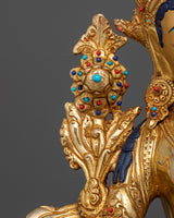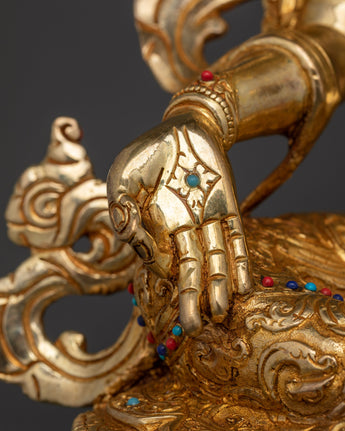 The sculpture has 24K gold gilding, which adds a rich and heavenly touch to its intricate design. It has a bright and spiritual aura, accentuated with gold and acrylic paintings. Crafted from a copper body and embellished with hand-carved gemstones, this piece blends craftsmanship and spiritual importance, making it an ideal addition to any meditation or shrine.