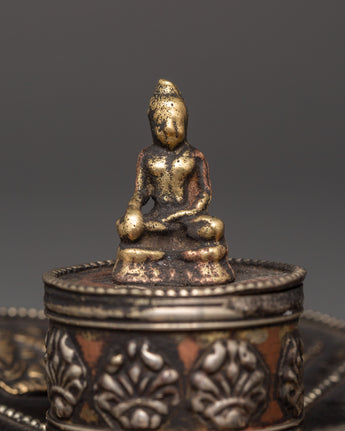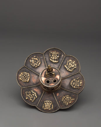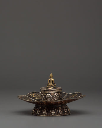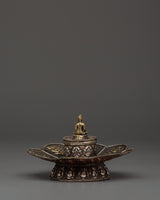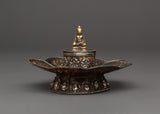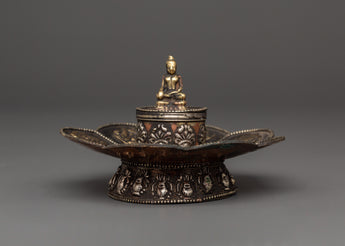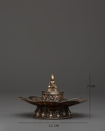This Buddha Incense Holder is ideal for burning stick incense, loose incense, or tiny aromatic offerings, gathering ashes, and diffusing soothing scents throughout your rituals. The harmonic blend of brass and copper demonstrates the traditional Tibetan design, while the seated Buddha represents enlightenment and mindfulness. This incense holder is an essential tool for creating a relaxing environment during prayer or meditation, making it ideal for practitioners and fans of Buddhist art. Use it to cleanse your surroundings, attract positive energy, and reconnect with your spiritual practice.