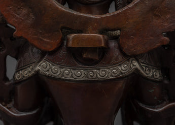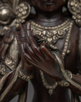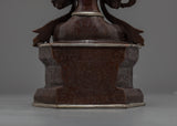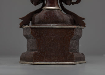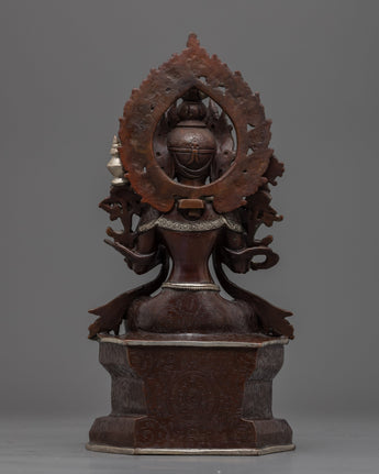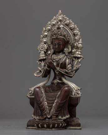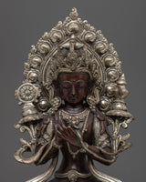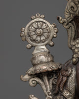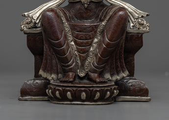 Hand-crafted with intricate details, silver plated on a copper body. This beautiful Buddha Maitreya Statue is a one-of-a-kind addition to any spiritual collection that will last a lifetime. Our master artisans have meticulously crafted it, making it ideal for those seeking a powerful connection to the divine Buddha of the Future. Buddha is shown seated on a magnificent throne, his hands are in Dharmachakra Mudra near his heart, and a lotus flower is beside his both shoulders.