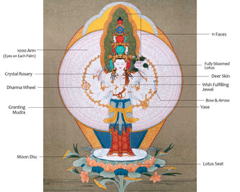 Avalokitesvara, "One Who Looks With Unwavering Eye," is the most revered Bodhisattvas, represents all Buddha's infinite compassion. His first two hands are joined holding the "wish-fulfilling jewel". The second right arm holds the crystal beads(rosary), his second left arm holds golden lotus with stem, his third right and left arm each holds mudra of supreme giving and empowerment vase respectively. He holds wheel of knowledge in his fourth right arm while holding a bow and arrow in his fourth left arm. These implements combined include the 8 principal arms of 1000 armed Chenrezig.