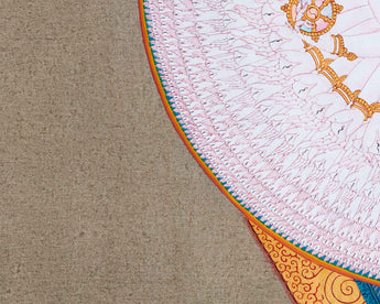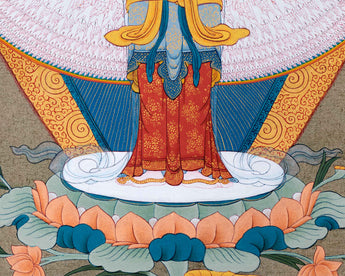 Immerse yourself in the divine energy of 1000 Arm Chenrezig, Buddha of compassion with this exquisite hand-painted thangka. Painted on cotton canvas using acrylic colors, this artwork captures the essence of Chenrezig's boundless compassion and his ability to assist all sentient beings. The depiction of a thousand arms symbolizes his limitless reach and willingness to help. Each hand holds significant symbols such as a lotus flower, bow and arrow, a dharma wheel, crystal rosary, and a vase, representing various aspects of his enlightened qualities. His peaceful and compassionate expression radiates wisdom and kindness, adorned with angelic attire and a crown embellished with precious jewels. The meticulous craftsmanship and vibrant colors of this thangka reflect the artist's dedication and skill. Displaying this sacred artwork in your home or meditation space will serve as a reminder to cultivate compassion and embrace boundless love and kindness in your spiritual practice.