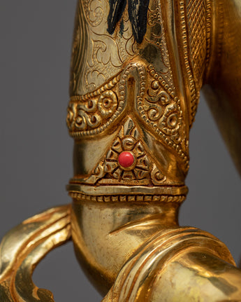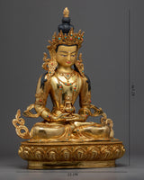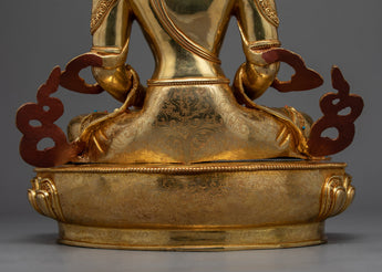 We have exclusively hand-carved the Buddha of Long Life Statue in the traditional Himalayan Art of Nepal. Here in the statue, we have depicted the deity seated upon a moon disc lotus holding a moon disc lotus while holding a vase that contains the nectar of immortality. For molding the statue, we used copper. On which intricate design patterns are hand-craved. The robe and crown are the main highlights of the statue. We have adorned with precious corals and gemtones. After hand-craving the designs, we gilded the figurine with genuine 24K gold. You can use this artwork for various purposes, such as in your regular meditational or yoga activities, in different Buddhist rituals, and for home décor things.