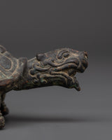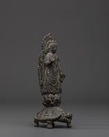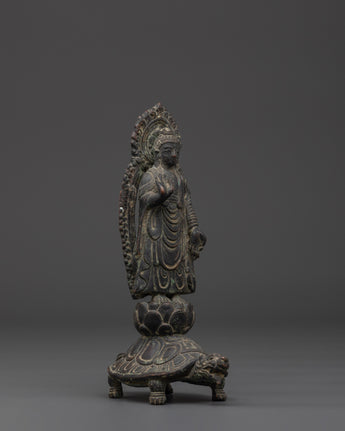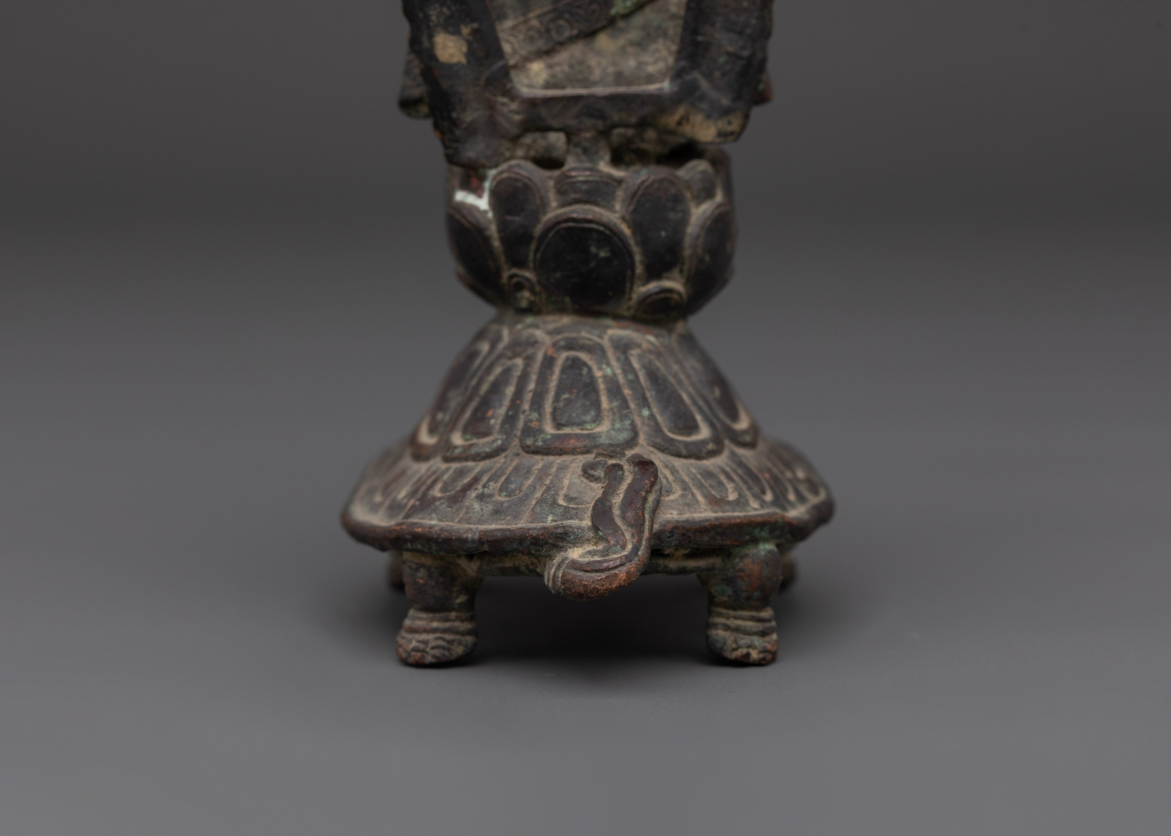 The sculpture in the image depicts a Buddha seated gracefully atop a turtle, symbolizing spiritual wisdom and longevity. The Buddha, with a serene expression and intricate robes, is shown in a traditional pose, exuding peace and enlightenment. The turtle, often associated with endurance and protection in many cultures, serves as a base for the Buddha, grounding the figure in stability and calm. The detailed craftsmanship of this piece reflects both artistic skill and profound cultural significance, making it a remarkable addition to any collection or spiritual space.
