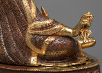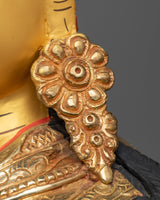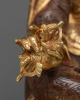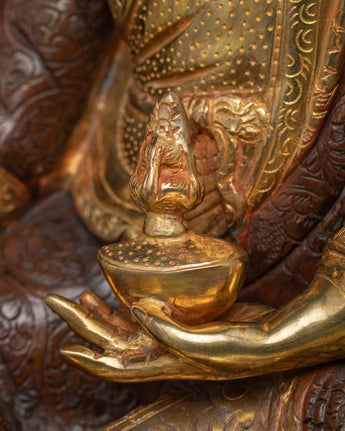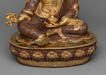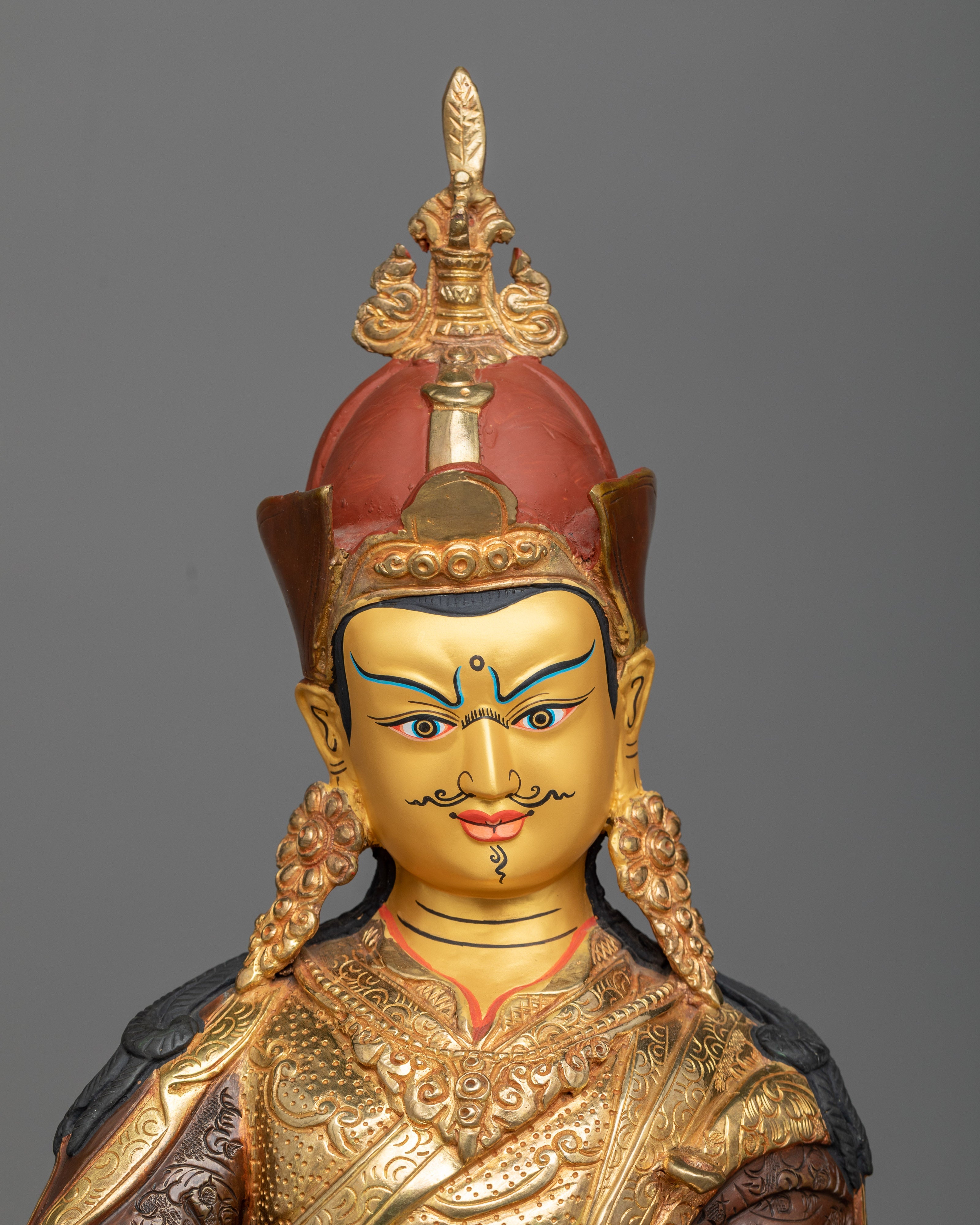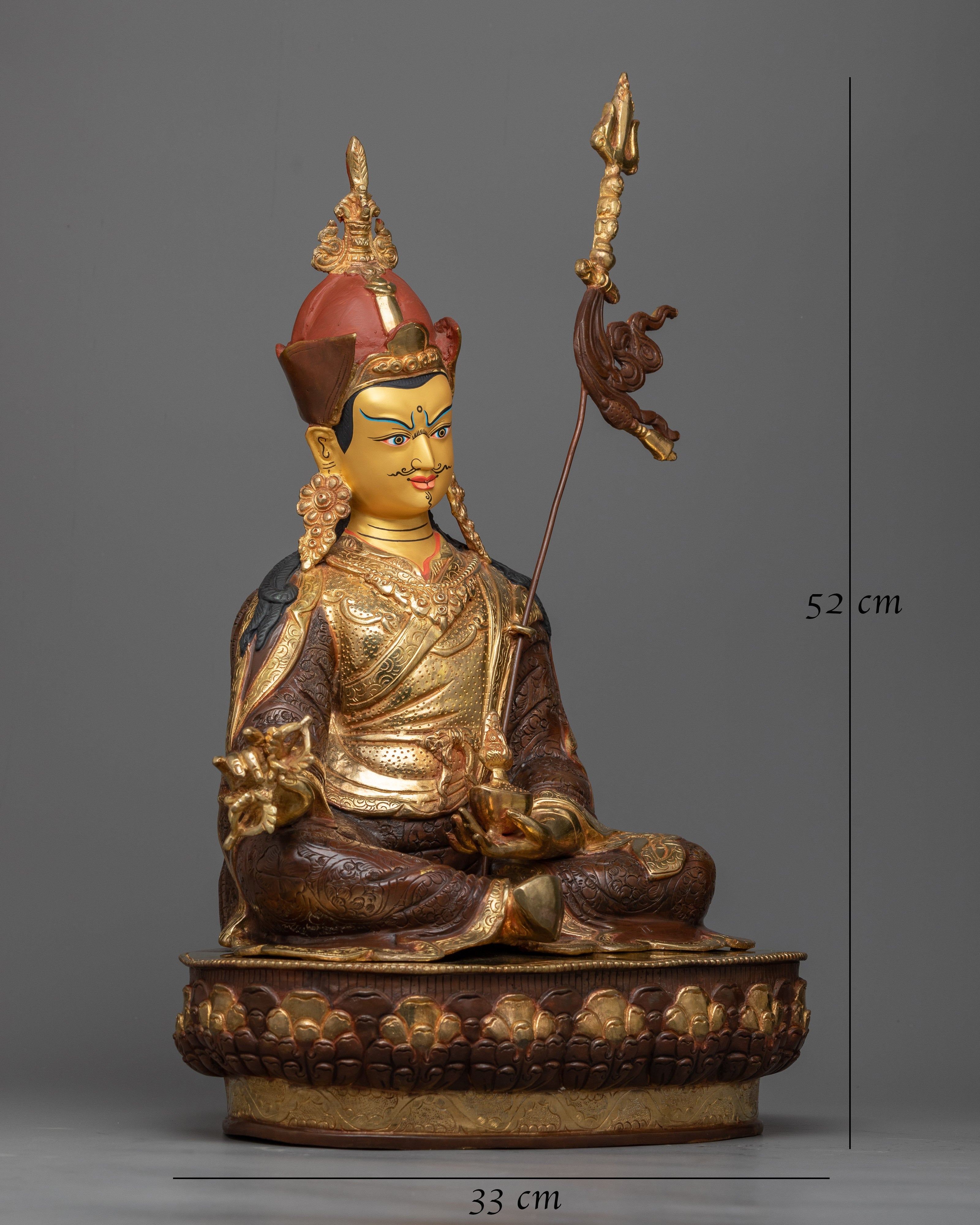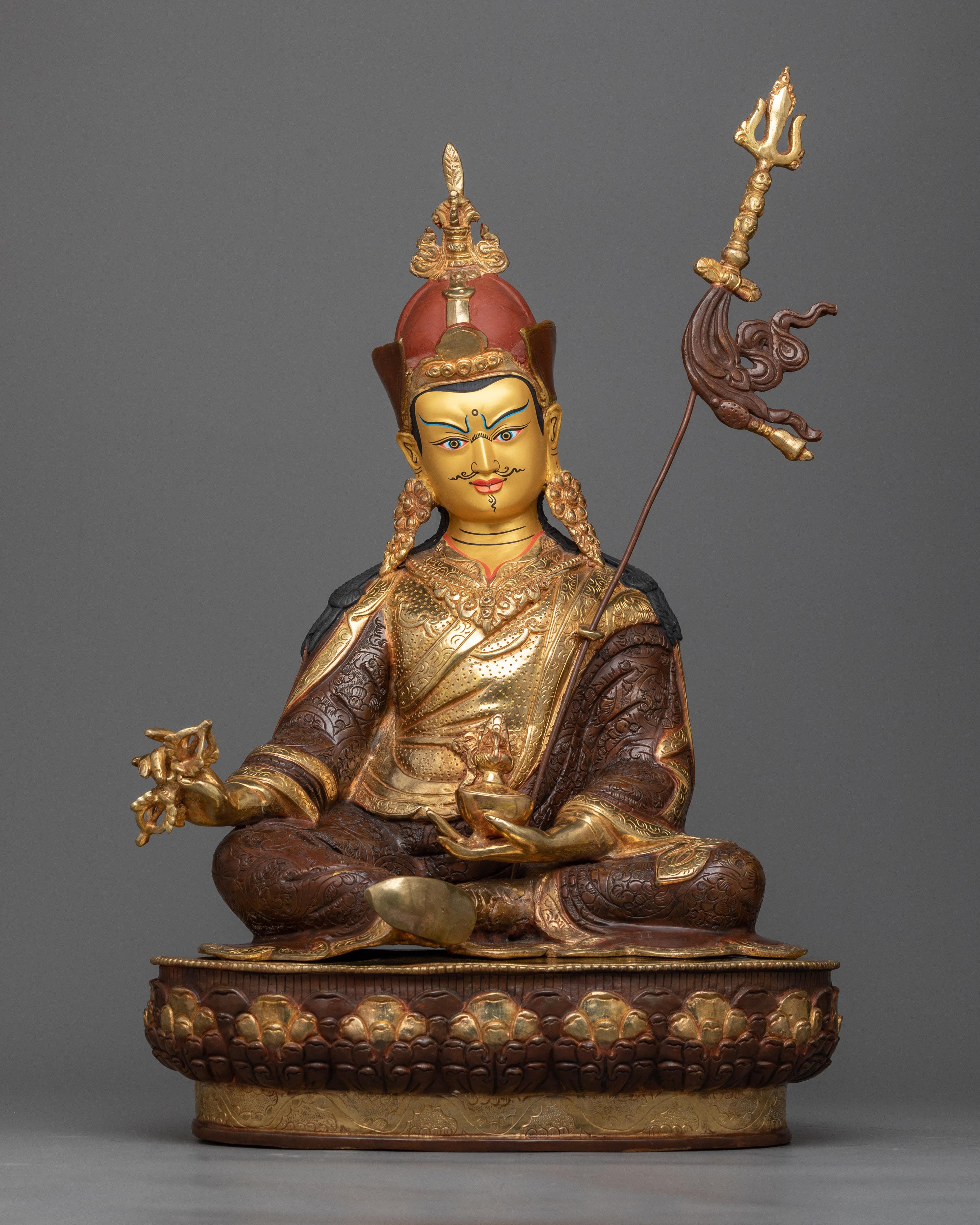 The sculpture's basis is a high-quality oxidized copper body chosen for its durability and ability to convey the great master's profound spiritual resonance. The statue is lavishly gilded in 24K gold, underlining its sacred nature and Padmasambhava's transforming teachings. The gold and acrylic paintings bring out the depth and texture of the details, from the guru's compassionate gaze to the intricate patterns of his robes and the symbolic implements he holds. Padmasambhava is depicted in his characteristic lotus position, with a vajra in his right hand and a skull cup in his left, accompanied by his khatvanga staff leaning against his shoulder — each element symbolizing his mastery over the spiritual and material realms.