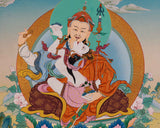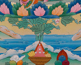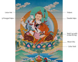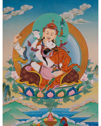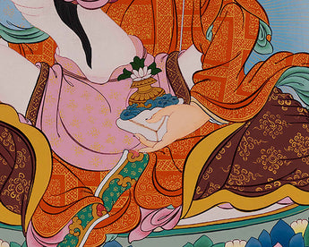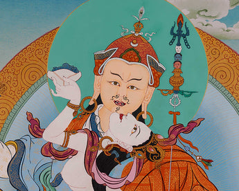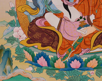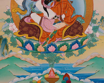 Buddha Padmasambhava With Consort Thangka is exquisitely hand-drawn on cotton canvas using poster colors and genuine 24K gold. In this thangka, we have portrayed Guru Rinpoche with his consort. He is seated, clutching a vajra in his right hand, a skullcap in his left, and a khatvanga with skull heads around his left arm. His consort is seated on his lap, embracing him with her right hand and holding a skullcup in her left. The beautiful background, nimbus, and robe all have intricate design patterns. All of these are drawn with delicate strokes of a brush. This art will be a perfect gift for practitioners like you to practice the Padmasambhava mantra.