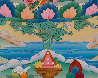 Twelve years after the Maha Parinirvana of the Buddha, the rays of blessing light of the Buddha of Infinite Light touched a lotus in the Milk Ocean in the Southwest direction from Bodhgaya. As a result, Guru Padmasambhava was born miraculously in that lotus by "lotus birth" without human parents.
