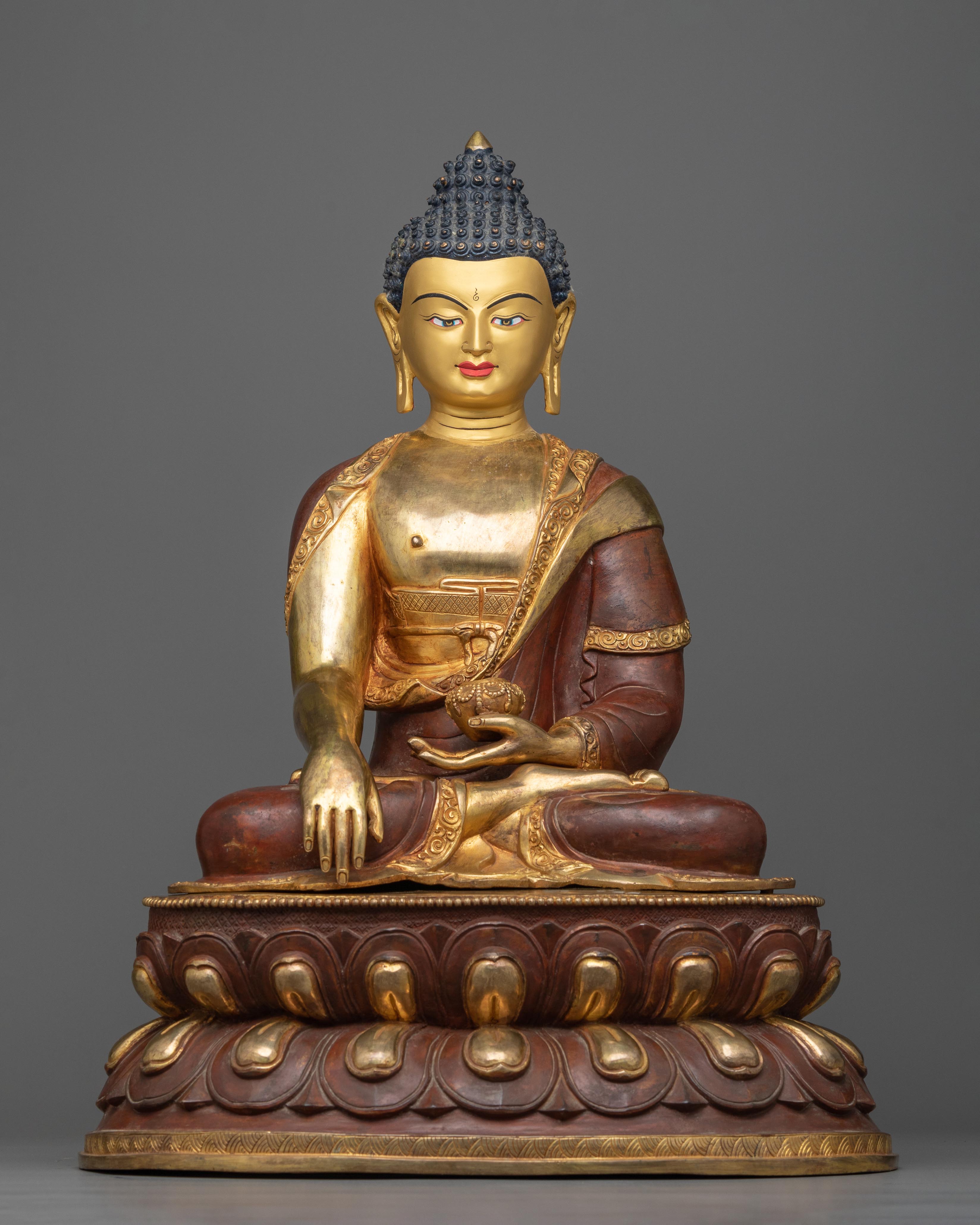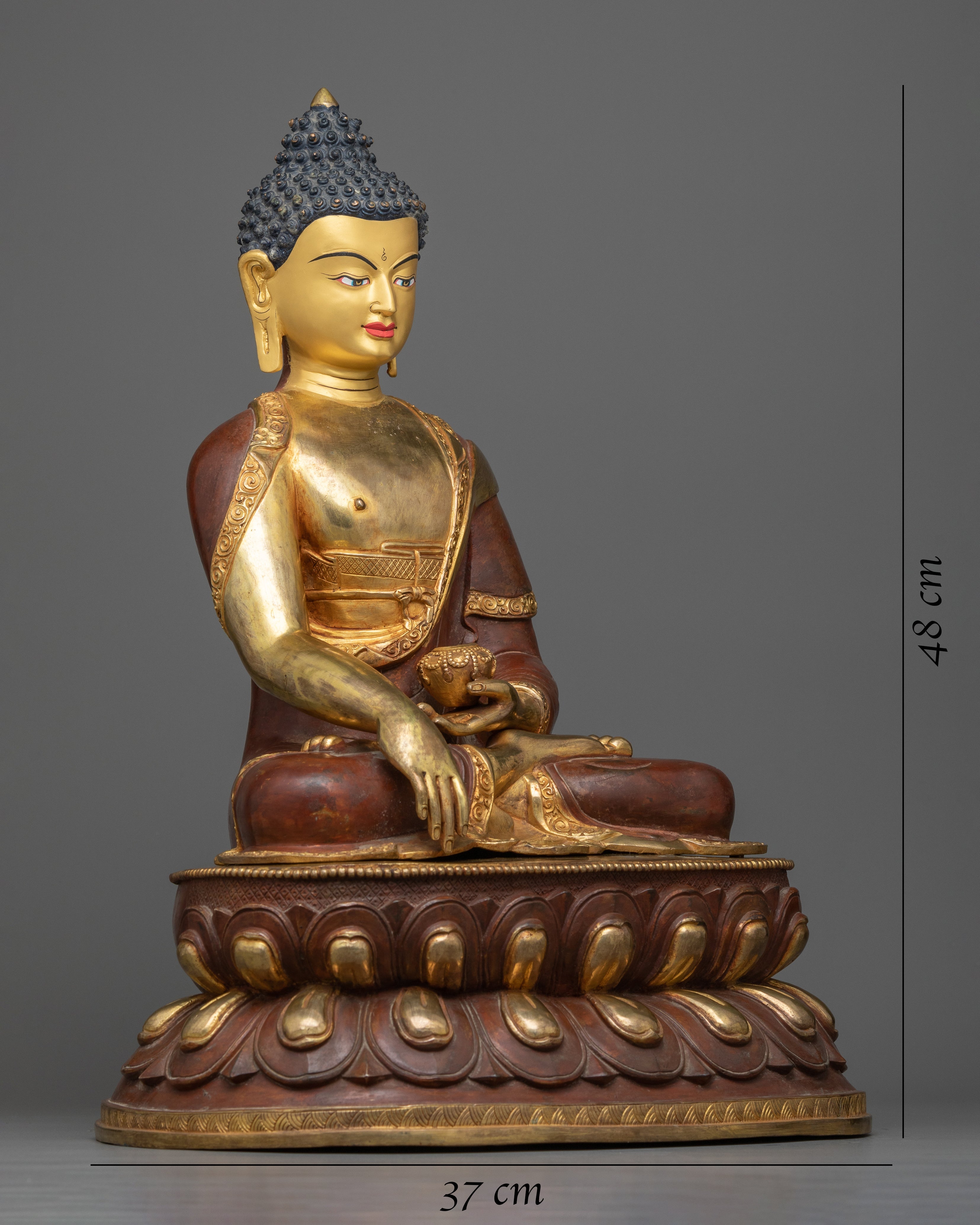 The statue is 18.8 inches and 48cm tall, a perfect shrine for your the center of your altar. The statue has slight antique touch to it. Made from a copper alloy and gilded in genuine 24k Gold. He is depicted sitting atop a double lotus seat with a calm expression. His right hand is downward in the earth-touching gesture (bhumisparsha mudra), with which he calls the earth goddess Sthavara to affirm that he is entitled to attain enlightenment, and in his right hand, he holds an alms bowl.