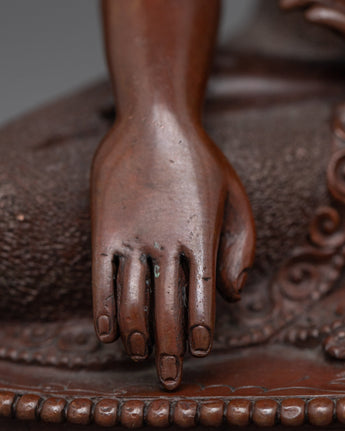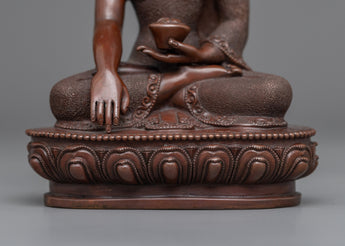 We created this stunning buddha Shakyamuni Kadampa statue in our studio using a traditional Himalayan carving technique passed down from generation to generation from Nepal. Shakyamuni Buddha is seen sitting on a moon disc lotus with an alms bowl on his left lap and his signature expression of serenity and peace. With his left hand, he makes the "Bhumisparsa Mudra," which symbolizes one of the most significant events in the Buddha's life—the moment the Buddha attained enlightenment and proclaimed the earth to be his witness.
