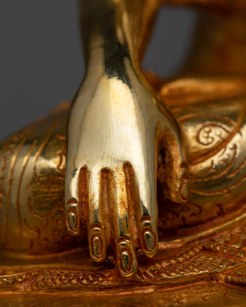 The statue is meticulously sculpted with gold and acrylic paintings highlighting Shakyamuni's peaceful demeanor and earth-touching mudra, symbolizing his awakening. This sculpture celebrates Shakyamuni Buddha's life and teachings, which continue to guide seekers toward spiritual liberation. The use of gold is a testament to the statue's sacredness and inspires a sense of reverence and mindfulness in the beholder.