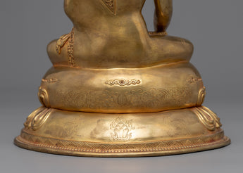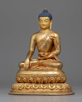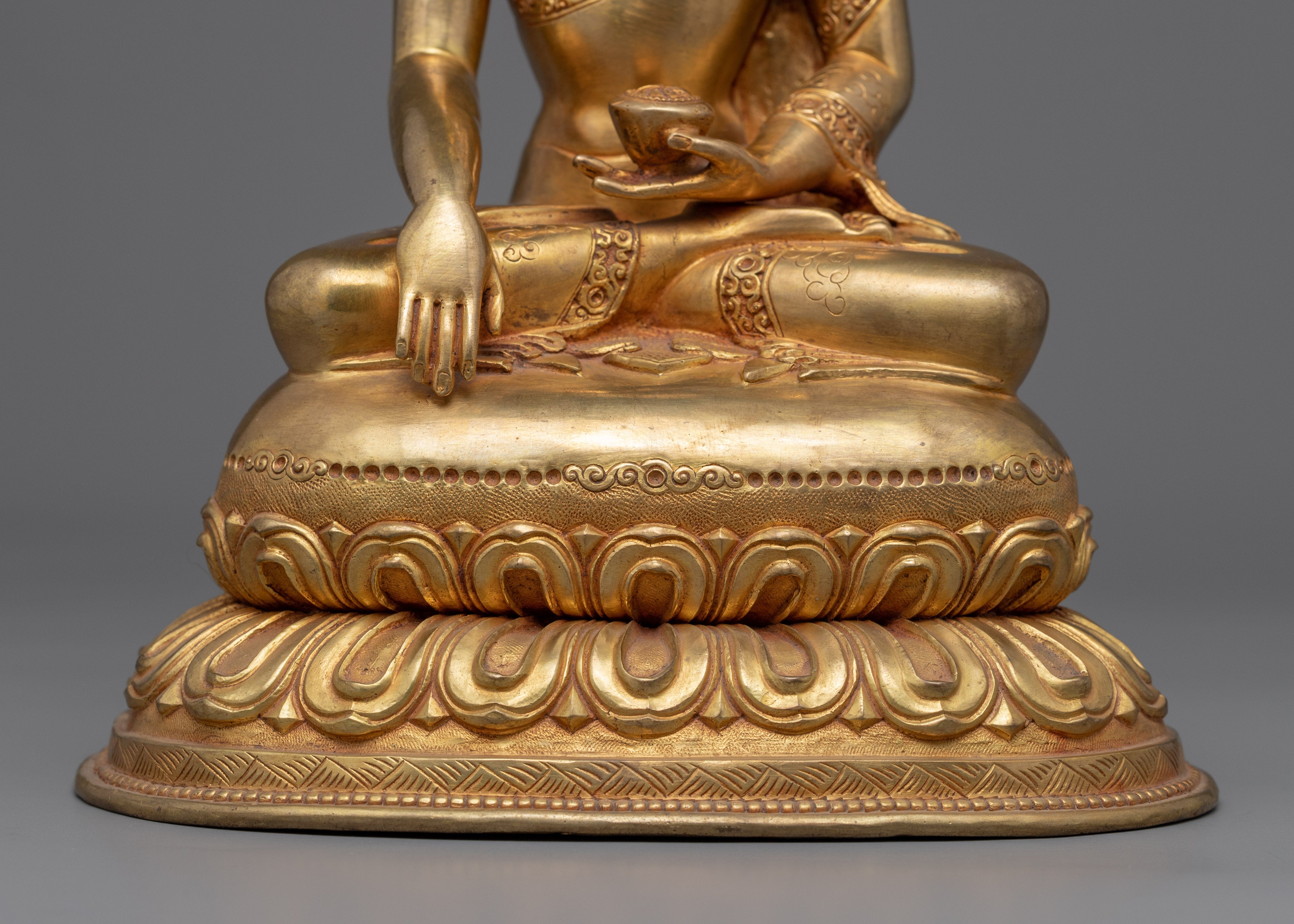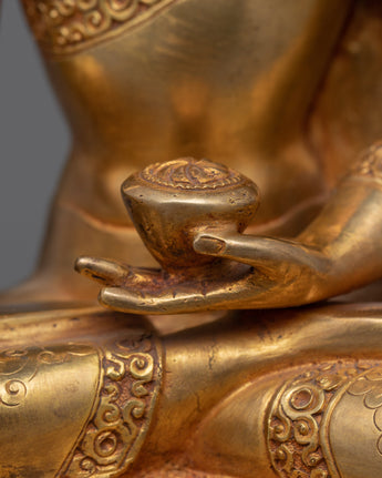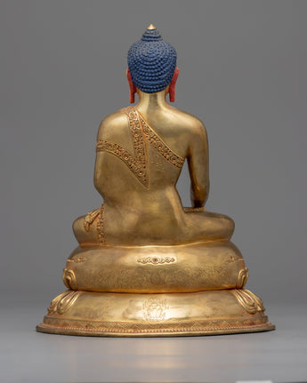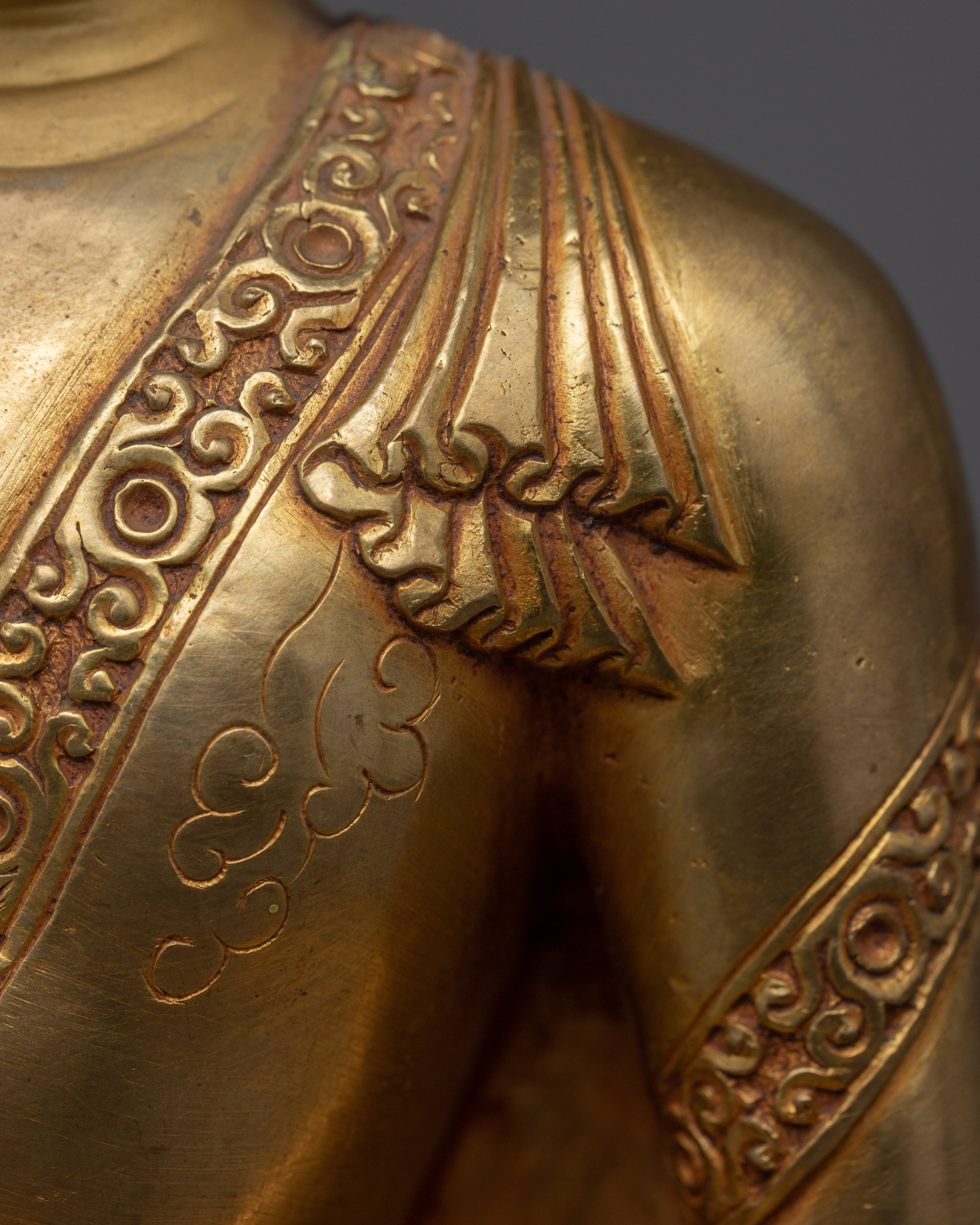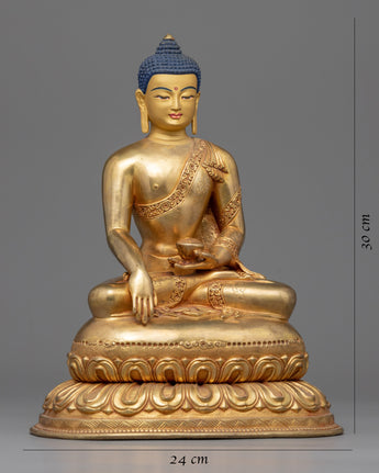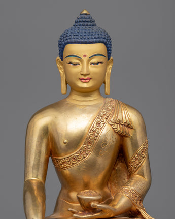 This stunning handmade Buddha Shakyamuni statue Seated in Meditation was created in our studio with the utmost care and precision. The statue depicts Buddha Shakyamuni with his hands resting in his lap, holding an alms bowl, and his other hand on earth touching mudra, symbolizing his enlightenment and wisdom. Buddha Shakyamuni is revered as the founder of Buddhism and represents his compassion and wisdom teachings. The intricate detailing and lifelike features are a testament to our Nepalese artisans' exceptional skills, passed down to us from generation old sculpting masters. this was molded on a copper body and then gilded in genuine 24k gold.