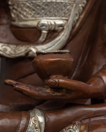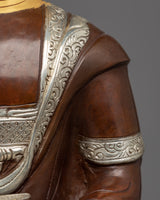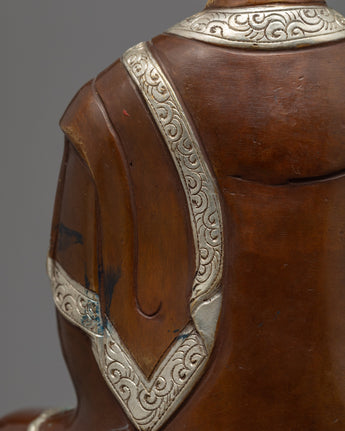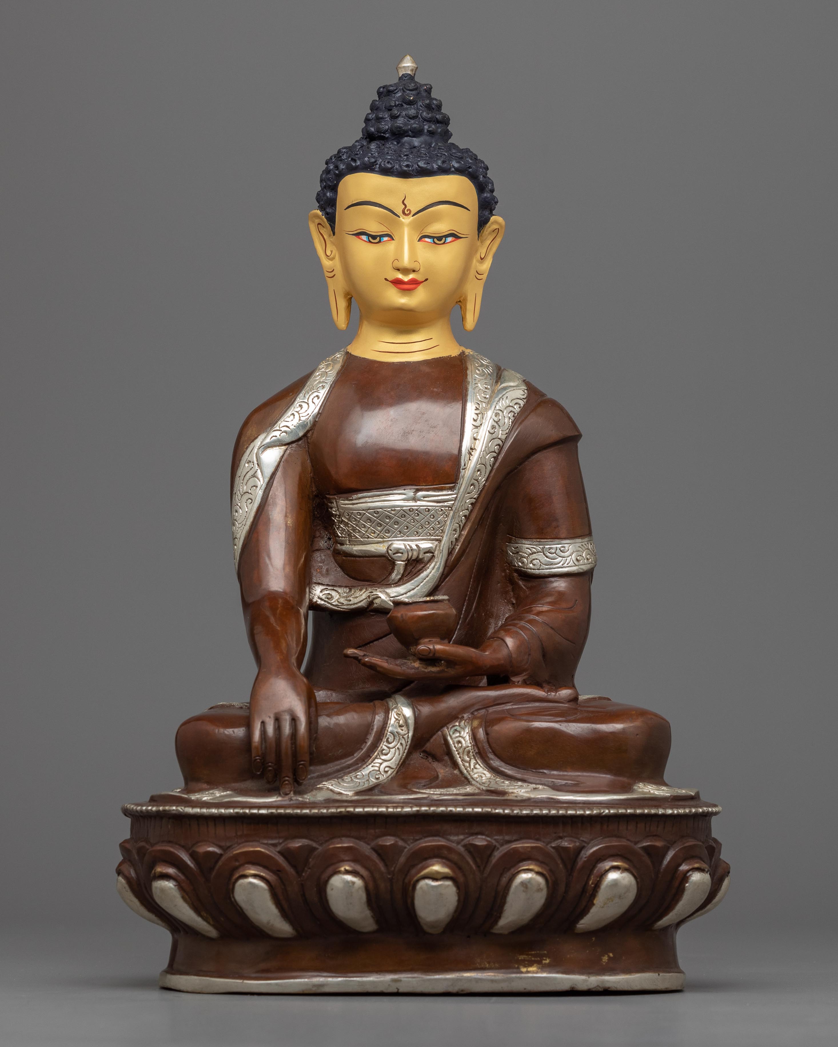 The Buddha Shakyamuni statue is an intricately handcrafted piece produced in our studio and designed with unique Nepali motifs. The Buddha is depicted seated on a moon disc lotus and holds an alms bowl in his right hand while portraying the 'Bhumisparsa Mudra,’ representing the Buddha's awakening as he claimed the earth as his witness. This piece is hand-carved out of copper and partially gilded in gold and silver with acrylic painting done over it.
