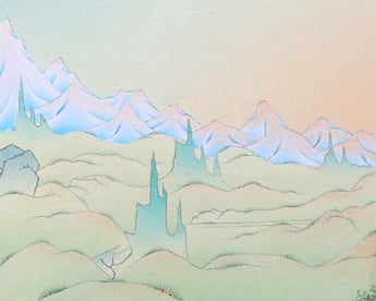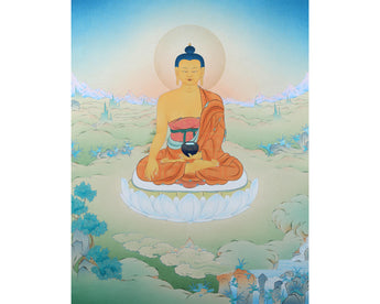 In this thangka, Buddha's right-hand forms a mudra, or hand gesture, which signifies his pacification of fear and, in certain contexts, that he is in the midst of teaching. His left hand is holding a begging bowl full of nectars.