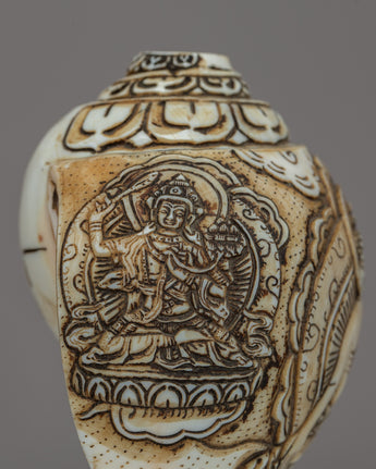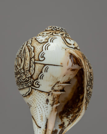 The Buddha Shankha Conch Shell is an artisanal masterpiece that has been meticulously fashioned on a conch shell. This magnificent artifact, embellished with intricately carved figures of Manjushri, Shakyamuni Buddha, and Chenresig, captures the essence of Buddhist mysticism. The images of these enlightened people serve as reminders of knowledge, compassion, and enlightenment, inspiring practitioners on their spiritual journeys.