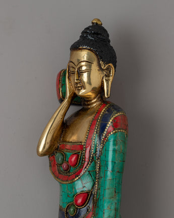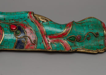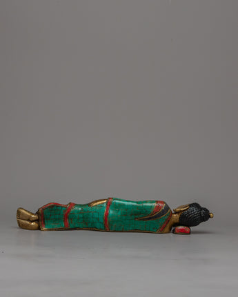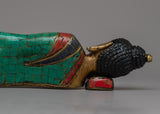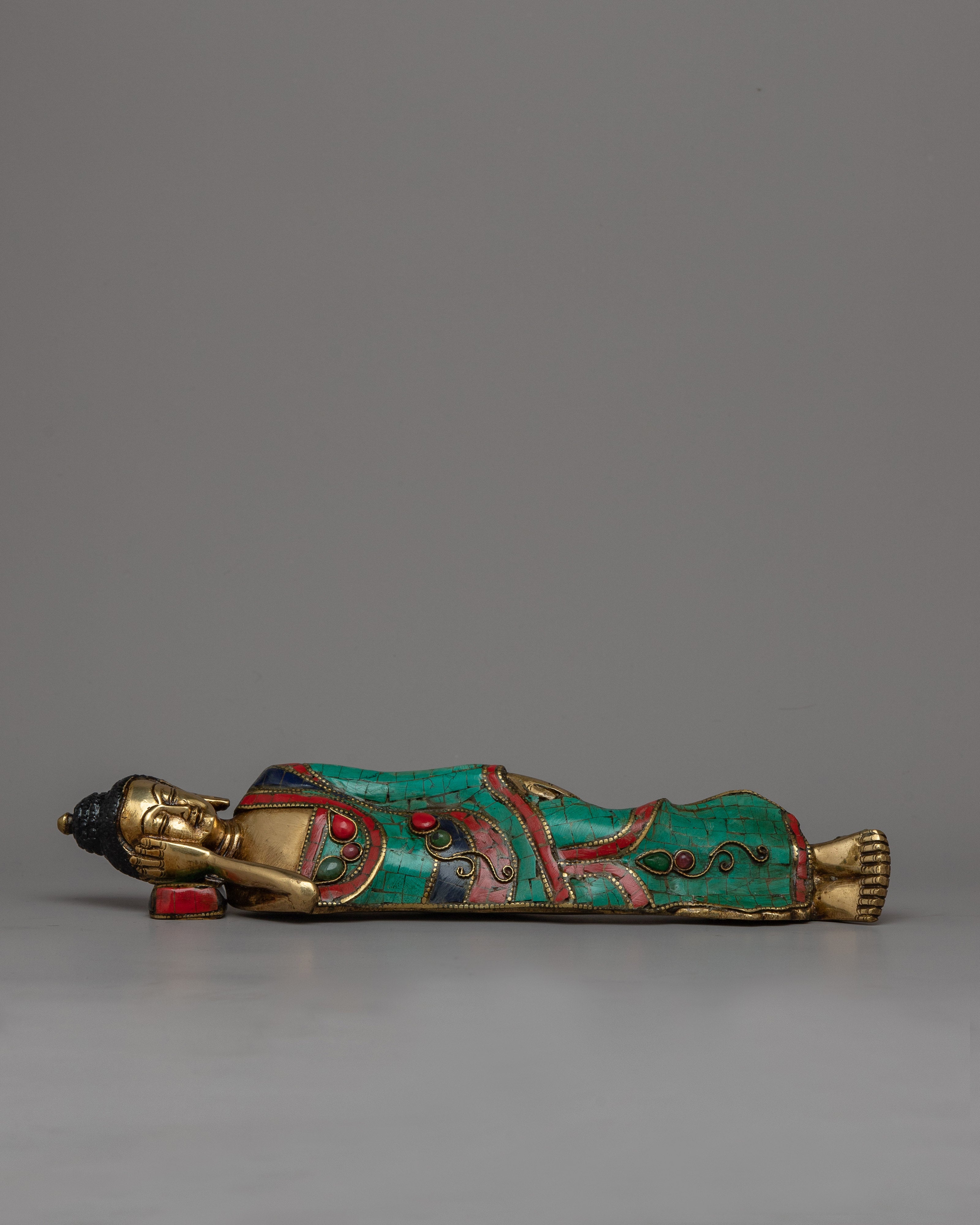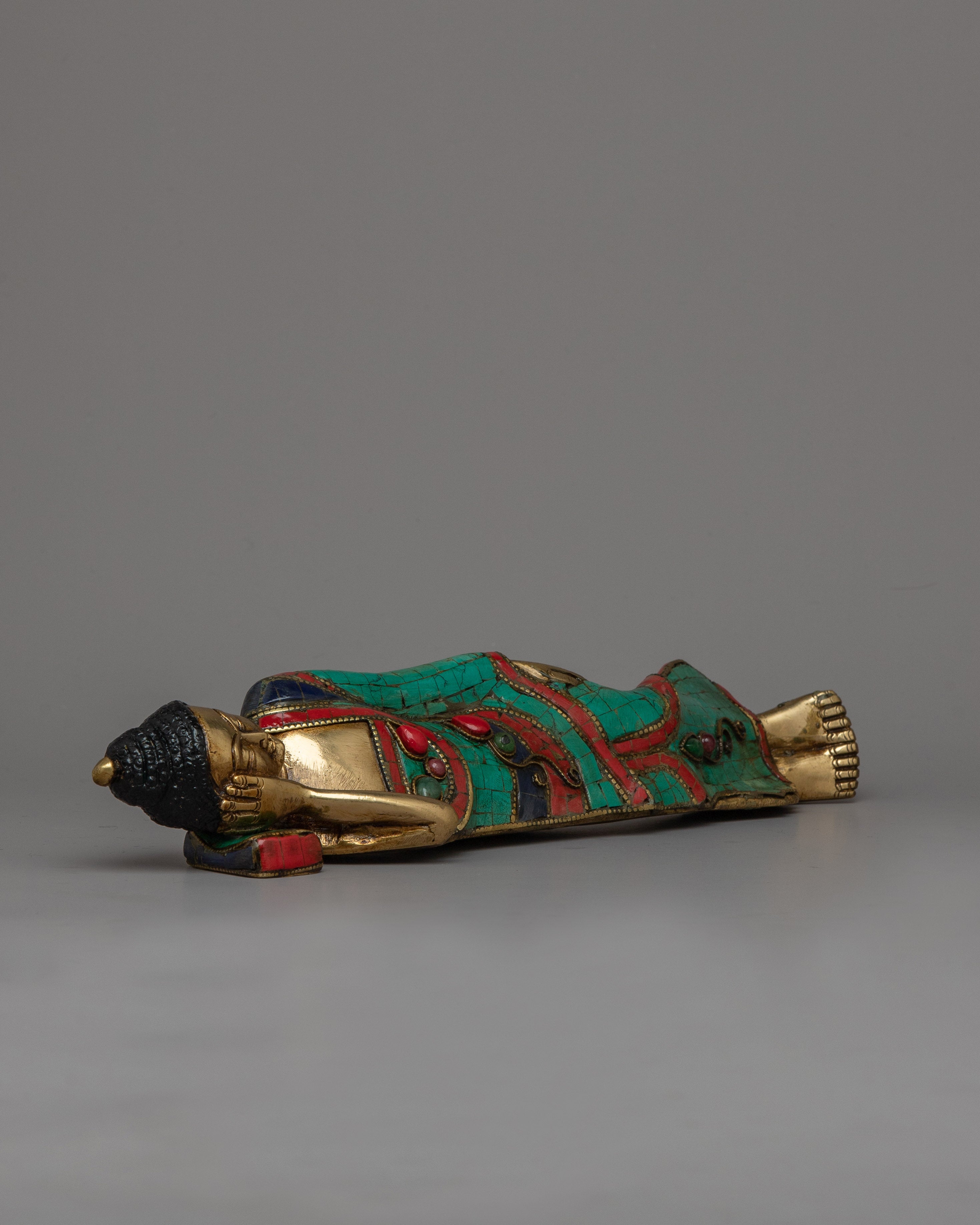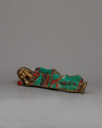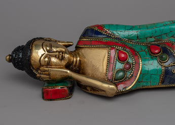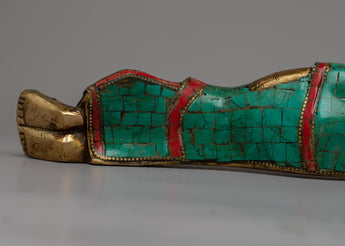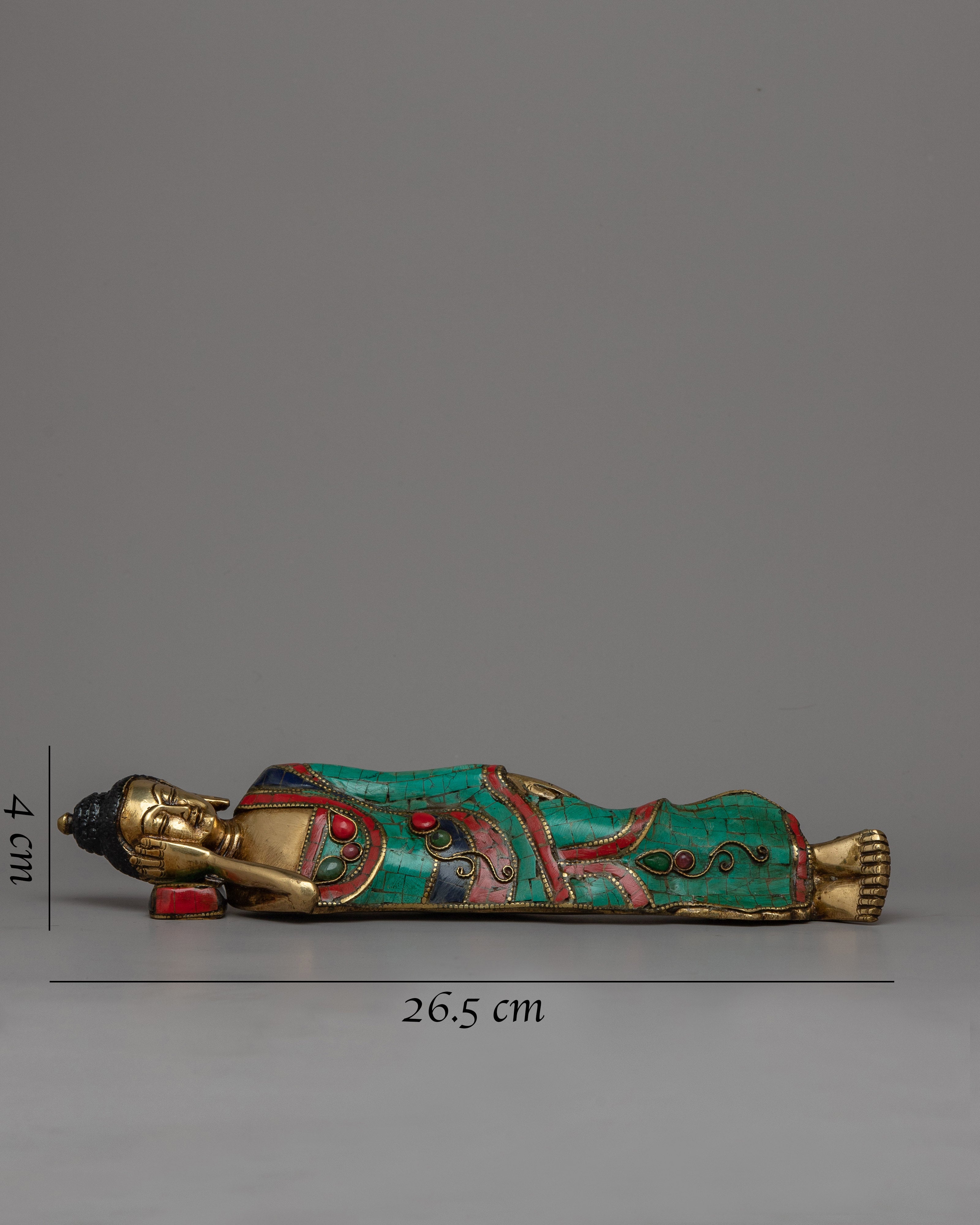 The Buddha Sleeping Posture Statue, a captivating embodiment of serenity and inner peace, beckons with its brass body adorned in the enchanting hues of turquoise, coral, and blue lapis. With a regal width of 26.5cm, it graces any space with an aura of mystique.
