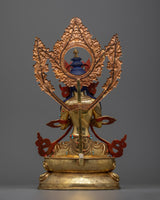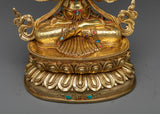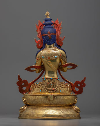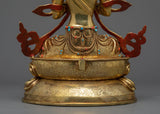 The statue is masterfully fashioned from sturdy copper and tastefully covered with sumptuous 24k gold plating. The delicate acrylic paintings add to its beauty, highlighting Vajradhara's teachings and characteristics with pinpoint accuracy.