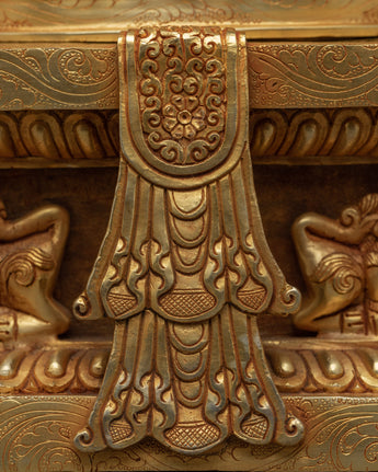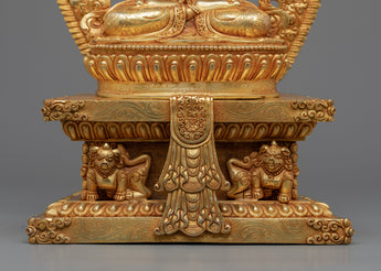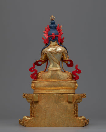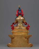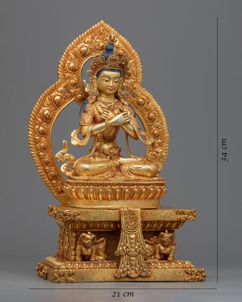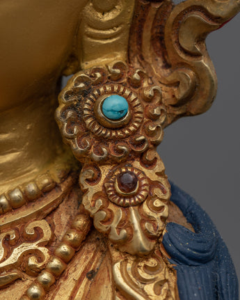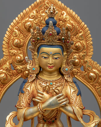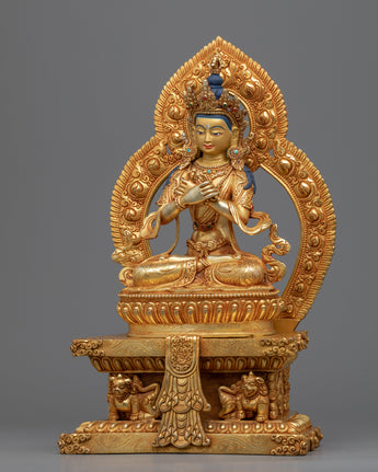 This magnificent Buddha Vajradhara statue was created by us using copper and 24K gold gilding. The sculpture was skillfully created and ornamented with valuable gemstones. His hands are crossed close to his chest as he reclines on a lotus seat while clutching a bell and a vajra. The crown, lotus, and other accessories' decorations are skillfully carved and authentically gold-plated, giving them a natural air of classic elegance. He has a calm, placid expression on his face, and the elaborate carvings on his clothing are minutely detailed. The statue's main highlight is the throne set with the halo and nimbus. The figurine weighs about 4.02 kg. Each minute detail is hand-carved using a hammer and chisel.