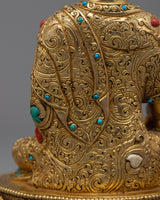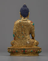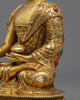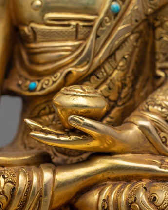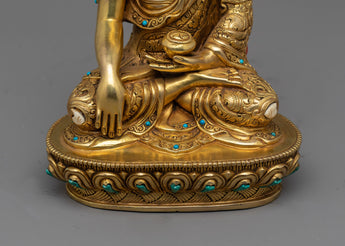 Discover the spiritual wisdom embodied by the Buddhah Shakyamuni Figurine, which is 6.9 inches tall and has a 5.1-inch base. Crafted from pure copper and enhanced with cautious 24K gold plating, the sculpture exudes spiritual depth and enlightenment. Each delicate stroke of the artist's brush, adorned with gold and acrylic paintings, reveals the pure essence of Shakyamuni Buddha. The hand-carved gemstone craftsmanship adds elegance and devotion to this figurine, transforming it into a sign of profound spiritual awareness.
