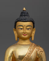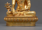 This Buddhist Bhaisajyaguru Healing Sculpture "Medicine Buddha", stands at a height of 8.7 inches (22 cm) with a base width of 5.9 inches (15 cm), making it a small yet sacred meaningful piece. Adorned with 24K gold gilding, the statue is ideal size to complement your altar, meditation area, or spiritual decor. The gold and acrylic paintings highlight the serene and compassionate expression of Bhaisajyaguru, the Buddha of Healing, crafted from a copper body.