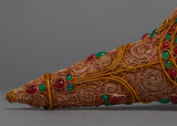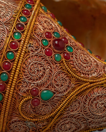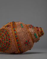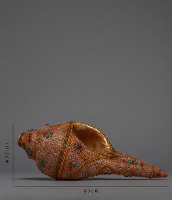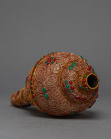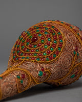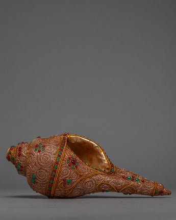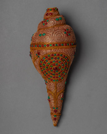 This beautiful conch shell is handcrafted from a copper body and then plated with 24k gold to create a radiant and regal appearance. The gemstones embedded in the shell add a touch of elegance and beauty, as well as spiritual significance. The conch shell is regarded as a sacred symbol in Tibetan Buddhism, representing the sound of the Buddha's teachings and the call to awaken to one's true nature.
