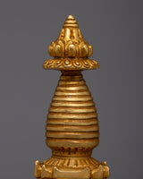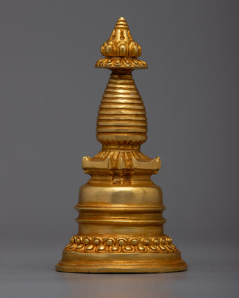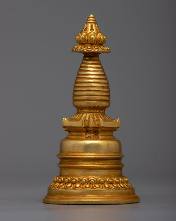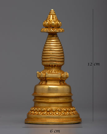 Presenting the 12cm tall, brilliantly plated 24k gold Buddhist Copper Kadampa Stupa, which is artisanal crafted to perfection. This magnificent object, crafted from fine copper, represents the core teachings of the Buddha and is a profound emblem of enlightenment and spiritual guidance.