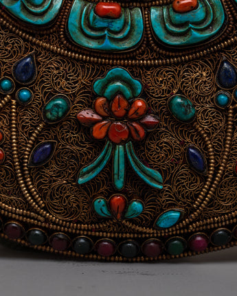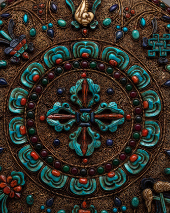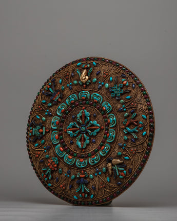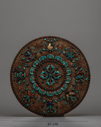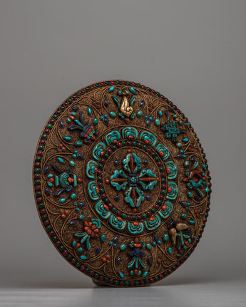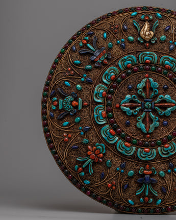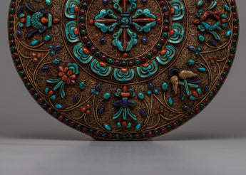 Immerse yourself in the spiritual depths of the Buddhist Copper Mandala, which showcases meticulous craftsmanship and sacred symbolism. Handcrafted on a shiny copper body and accented with rich electro-gold plating, this mandala features beautifully inlaid artificial coral, lapis lazuli stones, and a conch shell, each element carefully picked for its spiritual meaning.