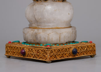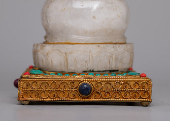 The Buddhist Crystal Stupa is a dazzling emblem of spiritual enlightenment, delicately carved on a Crystal stone with great precision and care. This precious object, adorned with 24k Gold Plating on a Copper body, emits elegance and divine energy, inspiring practitioners to further their spiritual path.