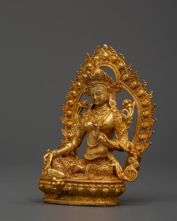 This copper statue of the Buddhist deity Green Tara, hand-carved with gold plating, represents the sacred feminine energy of compassion, protection, and swift action. This statue, measuring 11cm in height and 8cm in breadth and weighing 0.25kg, is an attractive addition to any spiritual space, altar, or house dedicated to mindfulness and healing practices.