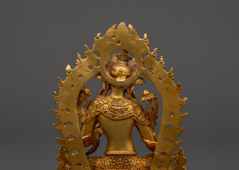 Green Tara, the compassionate symbol of swift action and protection, sits gracefully on a lotus throne in the royal ease pose (Lalitasana), representing her willingness to help all beings. Her right hand, stretched in the bestowing (Varada) mudra, bestows blessings, protection, and the fulfillment of wishes. In contrast, her left hand, lifted in the three jewels gesture, holds a lotus (Utpala flower), symbolizing purity and knowledge. The beautiful halo behind her exudes heavenly elegance. This Green Tara sculpture exudes tranquil power, making it an ideal representation for Vajrayana Buddhists or those seeking the energy of the divine feminine.