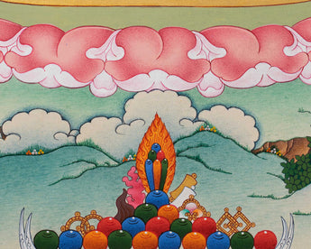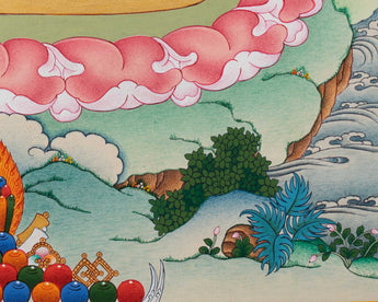 Vajrapani, revered in Buddhist tradition as the protector and guide, is vividly brought to life in this thangka through the use of Natural Stone Colors. These colors not only add a rich, earthy quality to the depiction but also symbolize the grounding and powerful energy of Vajrapani. As a deity known for his strength and courage in overcoming obstacles, the natural hues enhance his connection to the earth and the raw power of nature, offering a unique perspective for meditation and spiritual reflection.