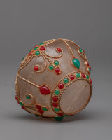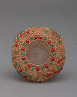 The Handcrafted Buddhist Golpa is carefully crafted on a crystal stone, highlighting its natural beauty and distinct qualities. The Golpa's intricate design is meticulously crafted, paying attention to the smallest details. Gemstones are thoughtfully embedded into the crystal, lending the piece a touch of elegance and vibrancy. The combination of the transparency of the crystal and the gleaming gemstones creates a visually stunning effect. This handcrafted Buddhist Golpa is an important symbol in Buddhist practice, representing spiritual purity, clarity, and the desire for enlightenment. Its exquisite craftsmanship and symbolic significance make it a prized possession for personal devotion as well as decoration.