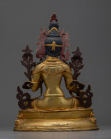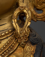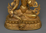 This meticulously made Buddhist Green Tara statue is a vision of calm and holiness, sitting elegantly in a meditation stance. The statue shines out, with a sturdy copper body and detailed 24k gold plating that reflects the light of enlightenment that Tara represents. This particular portrayal, with her embellished crown and exquisite jewels, exemplifies Nepalese craftsmanship's rich legacy.
