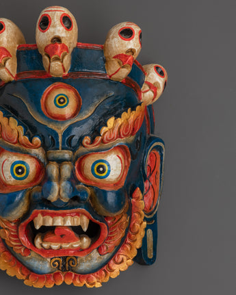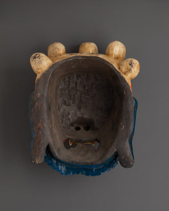 This handcrafted Tibetan wall art is intricately designed, adorned with five skulls on the crown, fiery elements, and classic patterns that emphasize its profound spiritual significance. Expertly crafted by Himalayan artisans, each piece reflects deep cultural symbolism and devotional artistry. Perfect for altars, meditation spaces, or as a bold decorative statement, this Tibetan Guardian Mask inspires both respect and spiritual reflection.