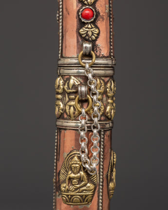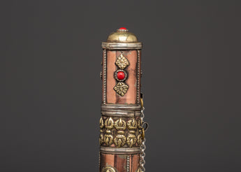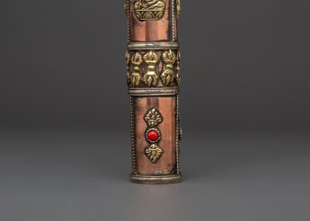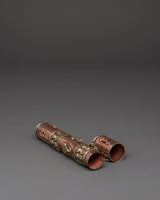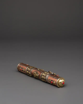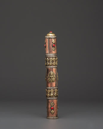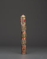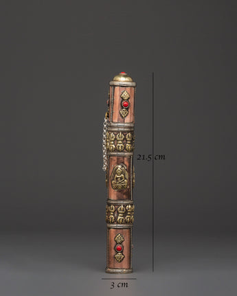 The Buddhist Incense Container is a beautifully constructed object combining utility and spiritual beauty. Standing 21.5 cm tall and 3 cm wide, this incense holder is copper and brass, giving it a typical Tibetan appearance. It weighs only 0.080 kg and is lightweight, making it excellent for travel or ceremonial use. The cylindrical shape and secure closure make it ideal for storing incense sticks on the go, keeping them fresh and protected from damage. This container, adorned with Buddha engravings and intricate patterns, is an essential accessory and a stunning piece of spiritual decor.