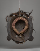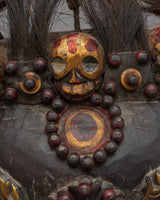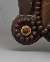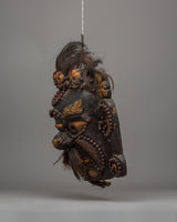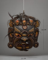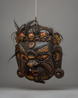This Mahakala mask depicts the ferocious protector deity of Tibetan Buddhism, a manifestation of compassion in wrathful form. The mask is ornamented with a skull crown, which describes the transcendence of ego and the impermanence of existence, while the wild flowing hair represents Mahakala's untamed strength. His piercing eyes and expressive features convey intensity and divine alertness, confirming his function as the protector of negativity and impediments. This Buddhist Mahakala mask, with its complex earrings and detailed work of art, is more than just a spiritual treasure; it is a masterpiece of Tibetan craftsmanship, excellent for anyone seeking protection, wisdom, and energy cleansing in their environment.