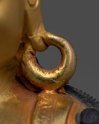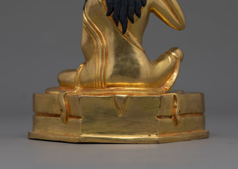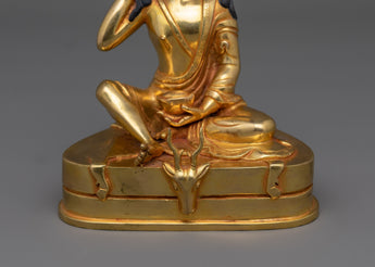 The Tibetan Jetsun Milarepa Sculpture stands at a height of 6.1 inches (15.5 cm) and has a base width of 5.7 inches (14.5 cm). This statue features a copper body that is gilded with 24K gold. The statue's surface is adorned with vibrant gold and acrylic paintings, enhancing its spiritual and artistic significance.