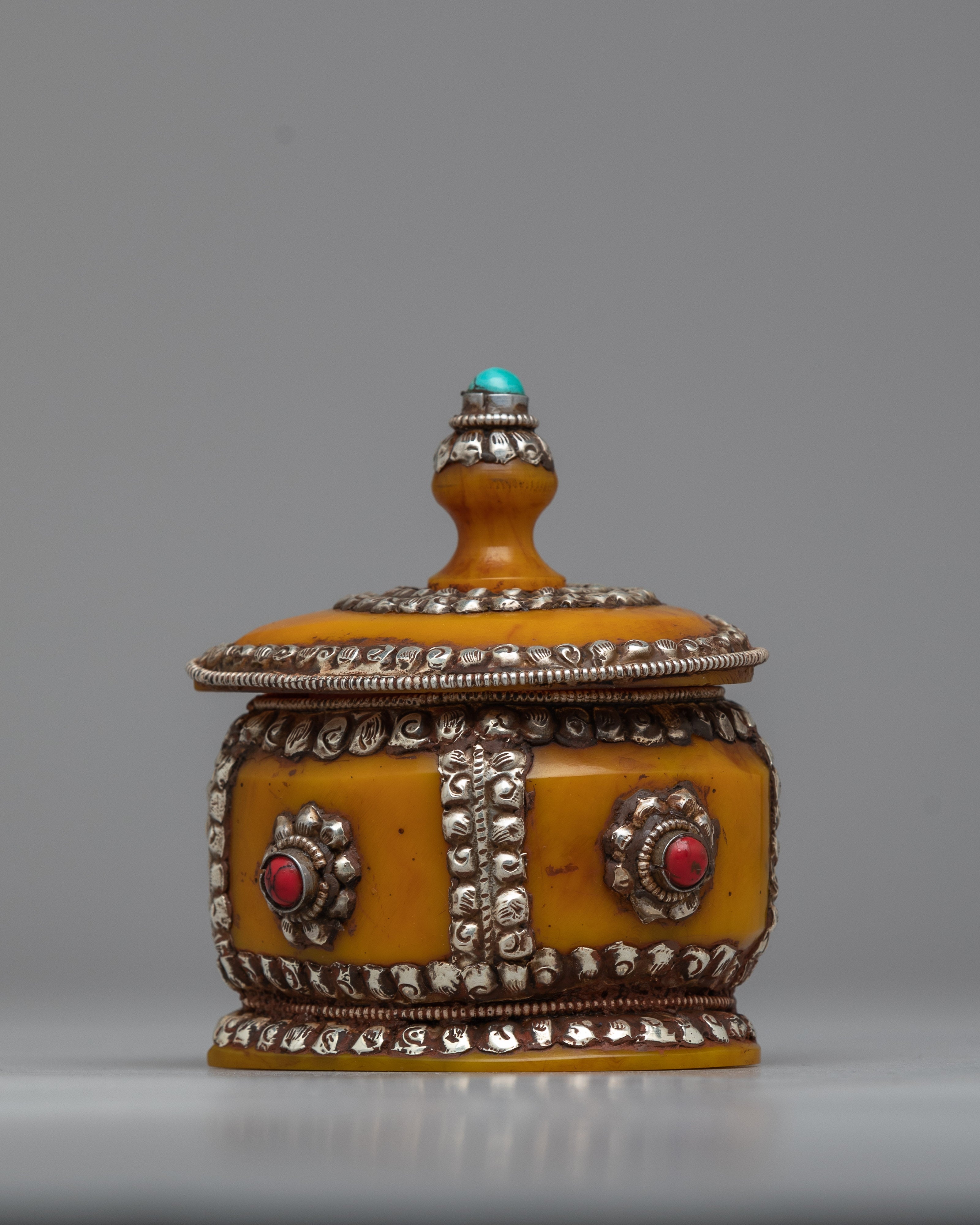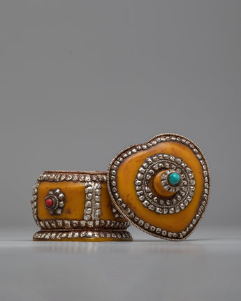 Introducing the Buddhist Metal Pot, a beautifully created object that harmoniously combines tradition and modern elegance. Handmade with care on a foundation of magnificent amber and accented with silver, its design oozes sophistication and everlasting beauty. The addition of yellow fiber material to the cup improves its visual appeal and gives warmth to any setting.