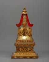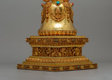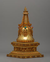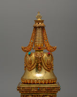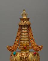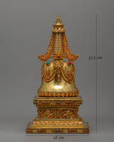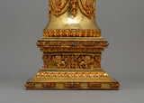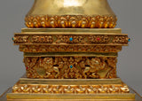 Beyond its stunning beauty, this gold-plated Nirvana Stupa has profound spiritual significance. Stupas are considered excellent meditation tools, serving as reminders of impermanence and the path to enlightenment. The presence of this sacred Tibetan stupa in a meditation place or altar radiates good vibes, spiritual protection, and wisdom. This handcrafted stupa is a magnificent manifestation of the Buddha's final teaching—the cessation of suffering and the ultimate calm of Nirvana—and can be used in ceremonial activities, Buddhist ceremonies, or as a personal meditation focal point.