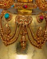 Our Buddhist Nirvana Stupa is an exceptional handcrafted spiritual treasure made of copper, beautifully gold-plated, and embellished with artificial turquoise and coral inlays. This stupa, measuring 33.5 cm in height, 18 cm in width, and weighing 1.44 kg, represents the pinnacle of spiritual enlightenment. In Buddhist tradition, the Nirvana Stupa depicts Buddha's transcendence of the cycle of birth and rebirth, entering Parinirvana, the ultimate freedom from suffering. The gold plating represents purity and divine light, while the embedded turquoise and coral stones strengthen its sacred energy, which is said to provide calm, protection, and enlightenment to those who meditate in its presence.