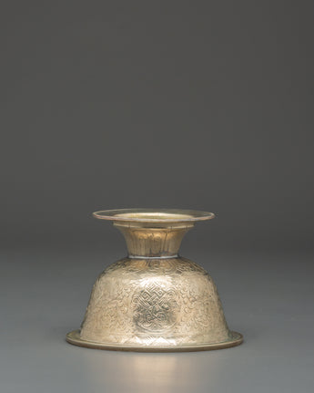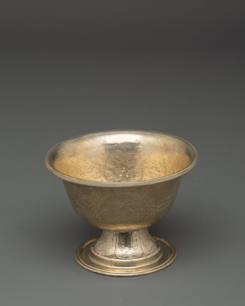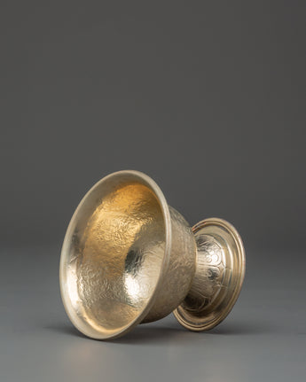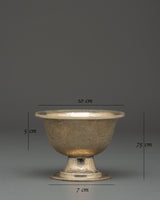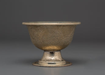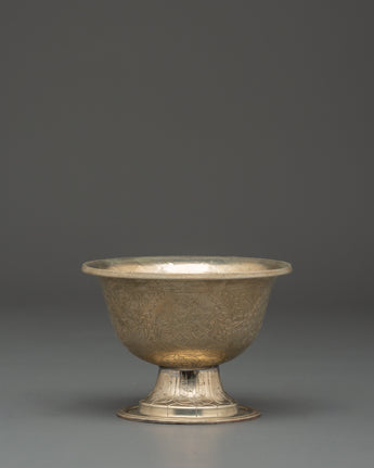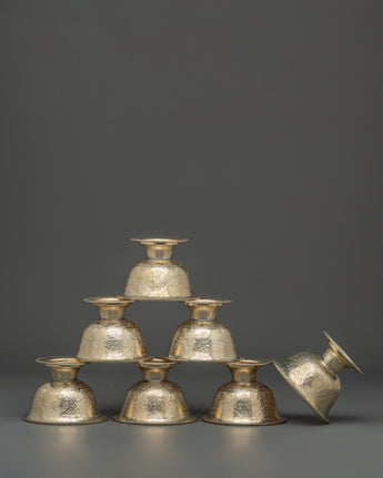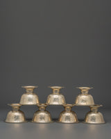 Enhance your spiritual practice with the Buddhist Offering Altar Set, a magnificent collection of handcrafted white metal bowls for traditional ceremonies and altar offerings. This elegant set includes wonderfully carved bowls measuring 7.5 cm (Height) x 7 cm (Base), with a diameter of 10 cm and an interior depth of 5 cm. The beautiful floral engravings on each bowl are traditional Tibetan workmanship, representing purity and dedication. These lightweight bowls, weighing 0.106 kg each for a total weight of 0.786 kg, are ideal for storing water, grains, or other symbolic gifts during meditation and ceremonial activities.