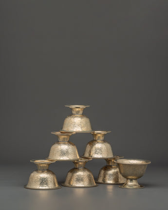 This Buddhist Offering Altar Set is ideal for spiritual practitioners, collectors, or those wishing to add to their Buddhist decor. It combines purpose with aesthetic appeal. With their handcrafted quality and traditional style, these bowls provide a significant present for individuals who value the confluence of artistry and spirituality. These Tibetan ritual bowls, whether used for daily prayers or as a decorative focal piece, embody the age-old custom of offering and appreciation. With this beautifully designed set, you can enhance your spiritual path while decorating your home.